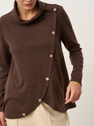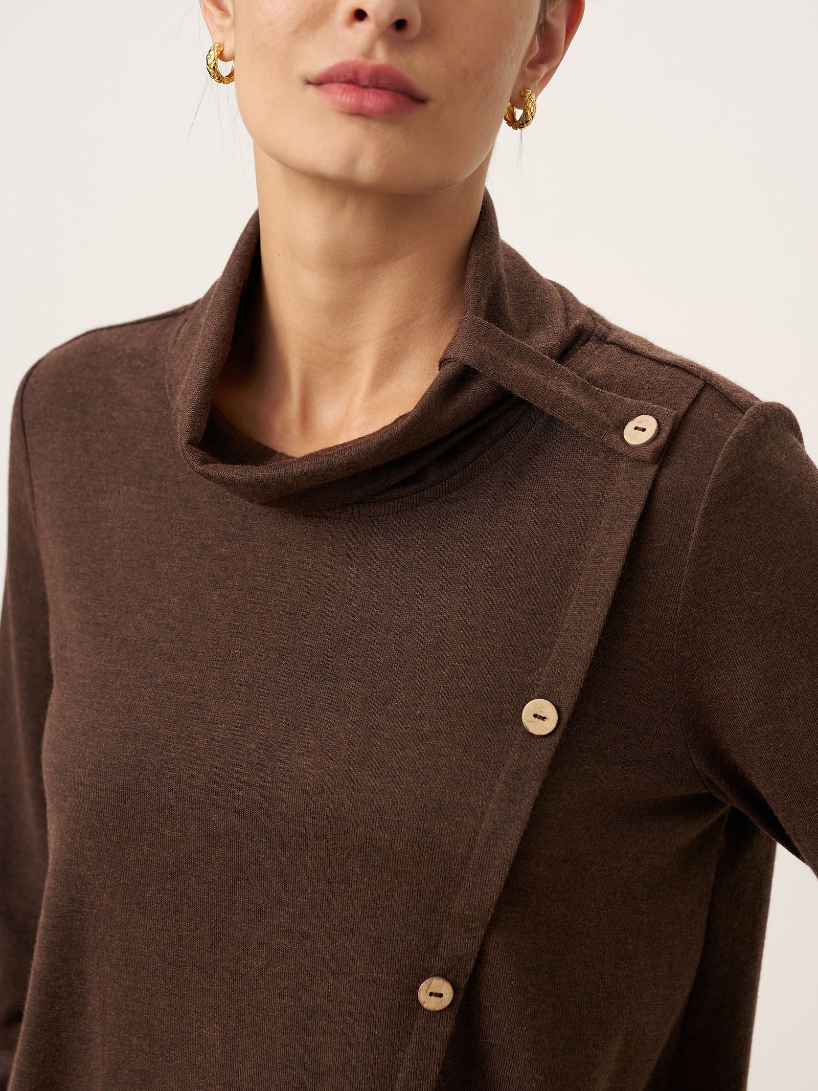 - Design de patte incurvée : L'encolure asymétrique avec boutons en noix de coco allonge le torse tout en ajoutant une texture organique pour une dimension flatteuse.