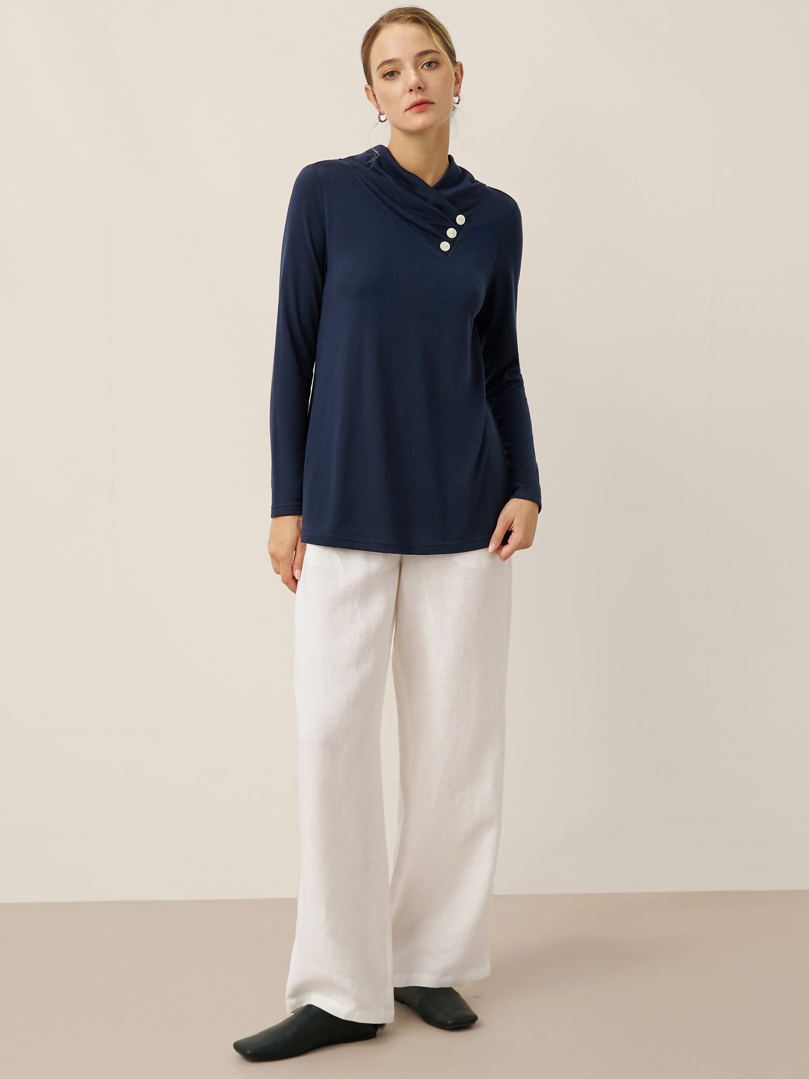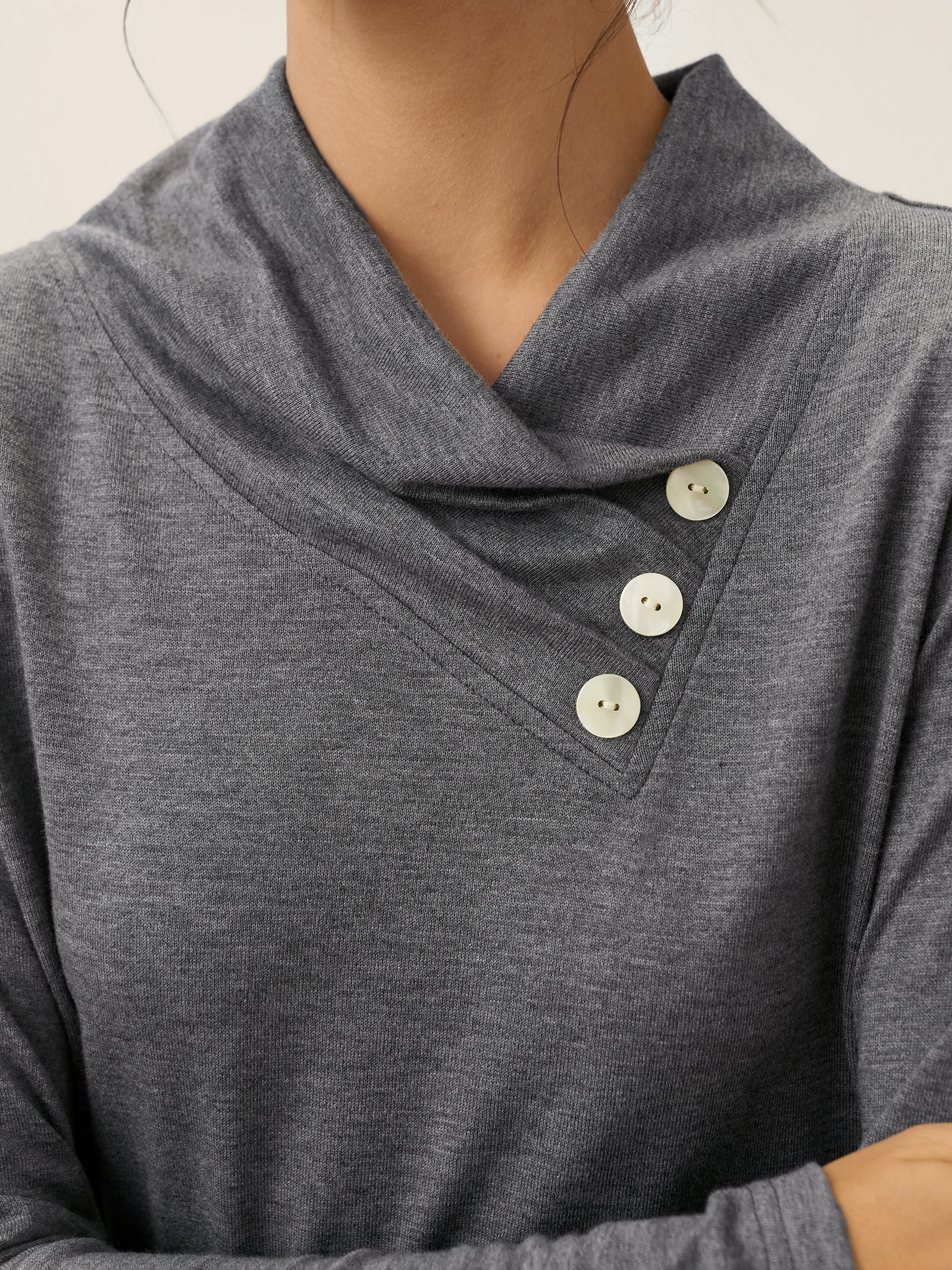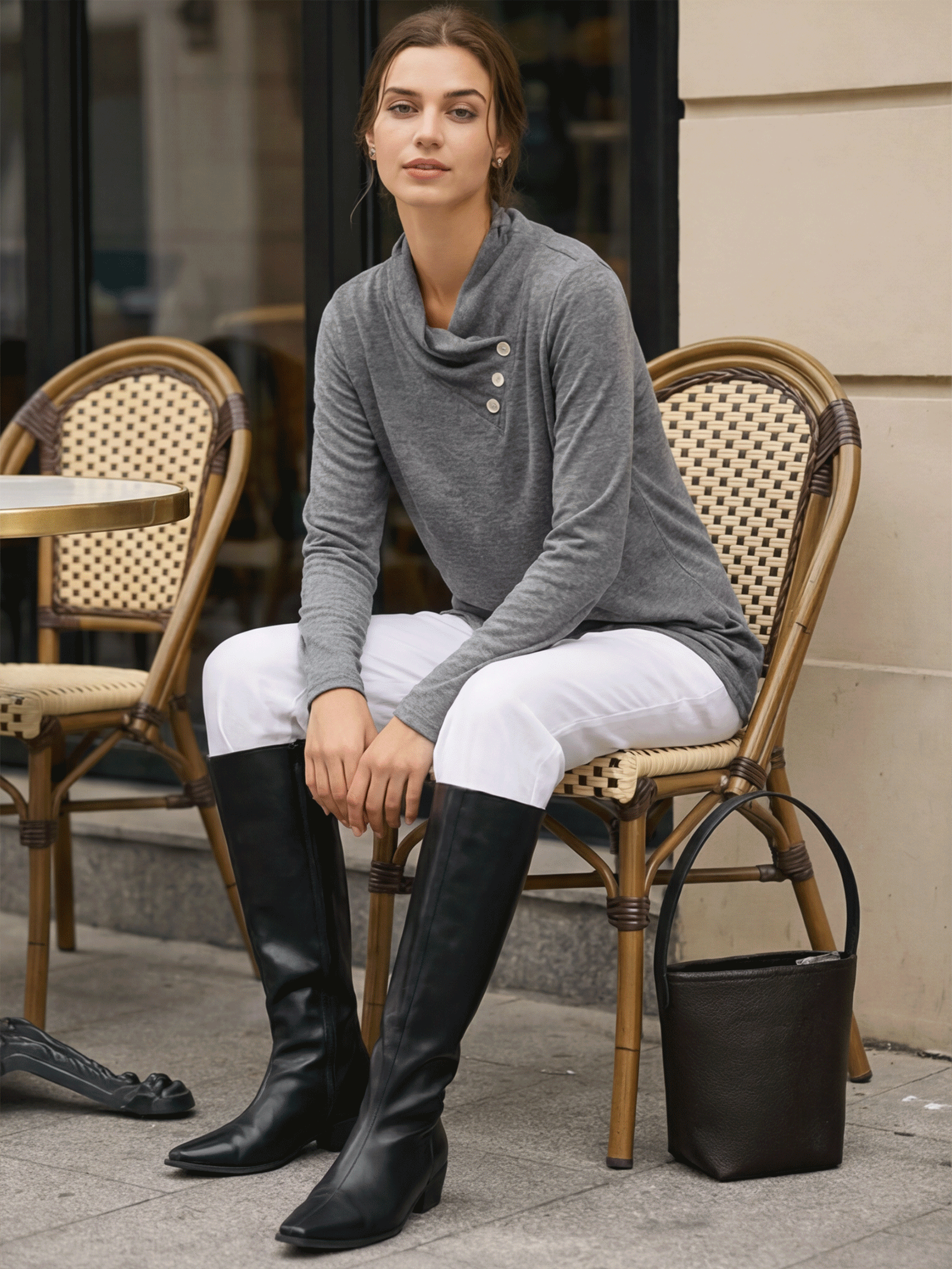 Haut asymétrique à manches longues présentant des détails structurels et une couverture étendue pour une polyvalence contemporaine.
