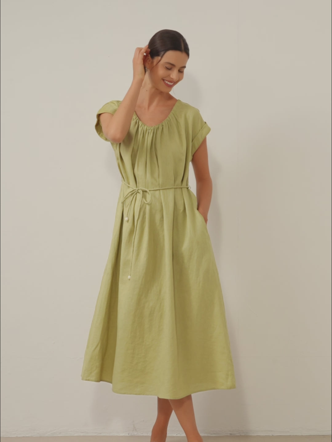 Robe longue plissée à col rond 100% lin avec bretelles amovibles MIRA