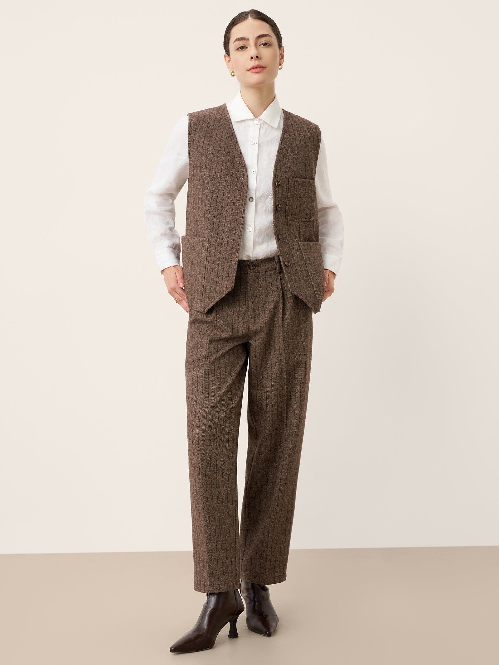 - Rayures Allongeant la Silhouette: Les fines rayures tennis bordeaux et le tissage sergé texturé créent une illusion verticale pour une stature plus élancée et élancée