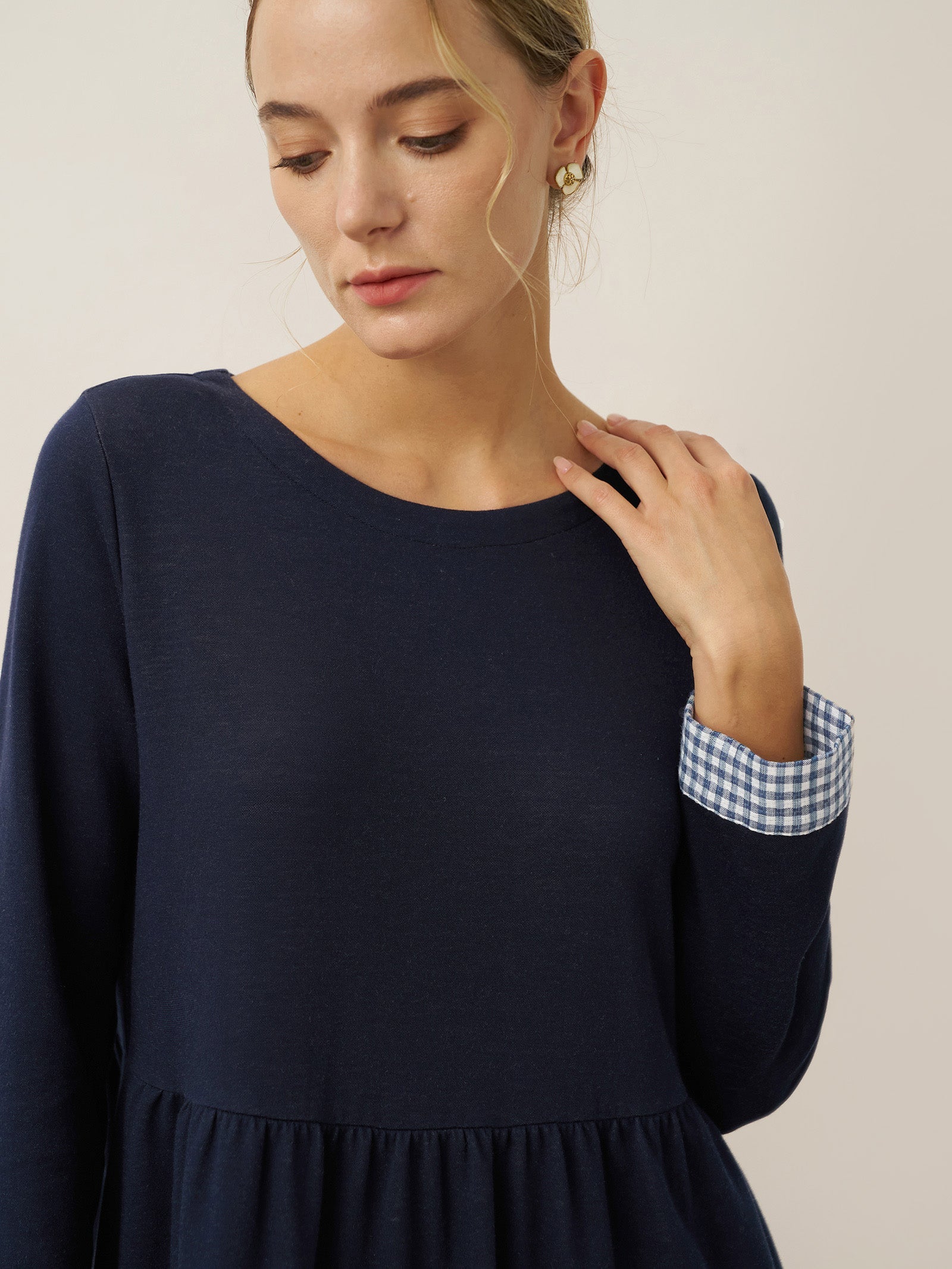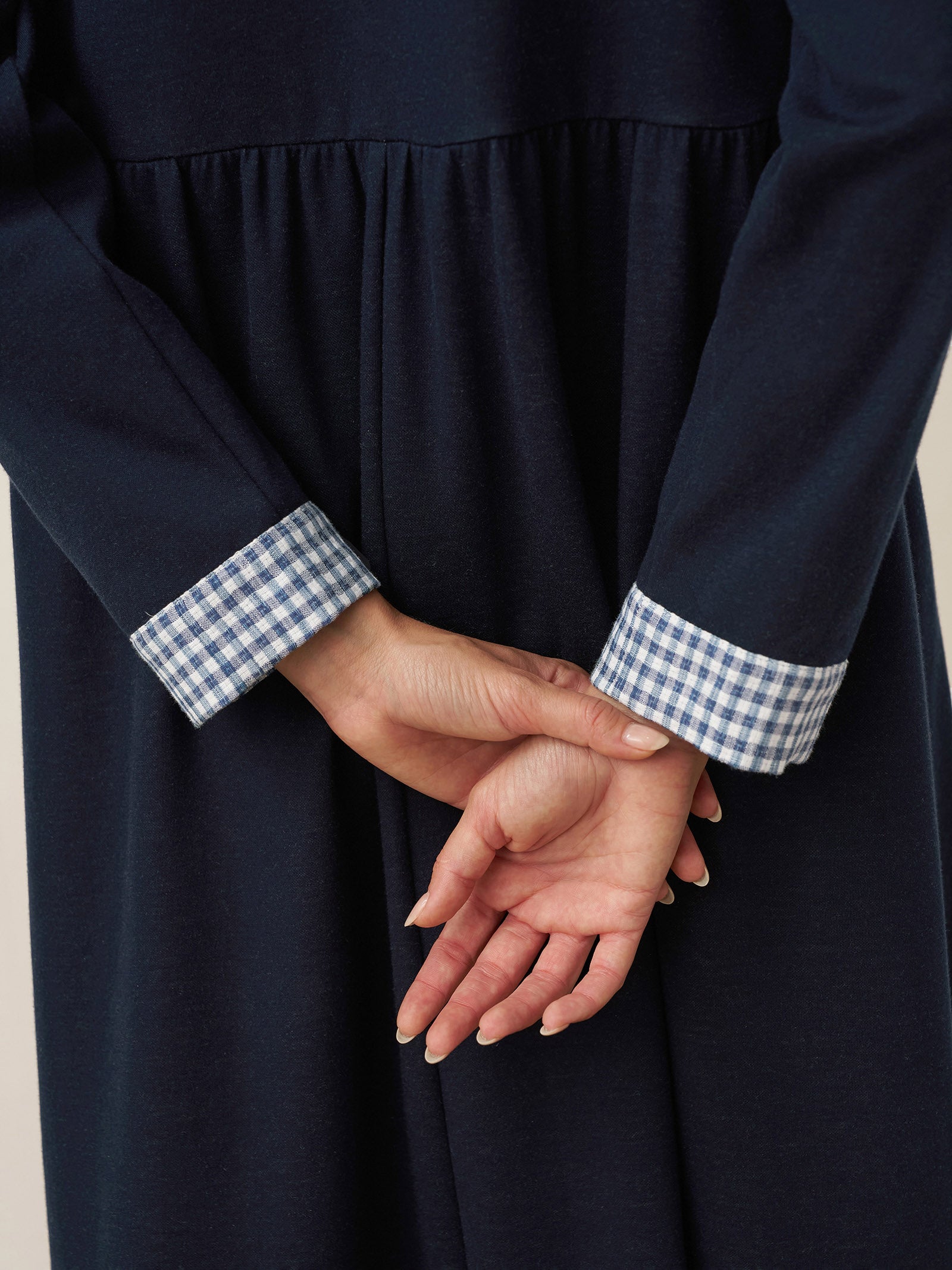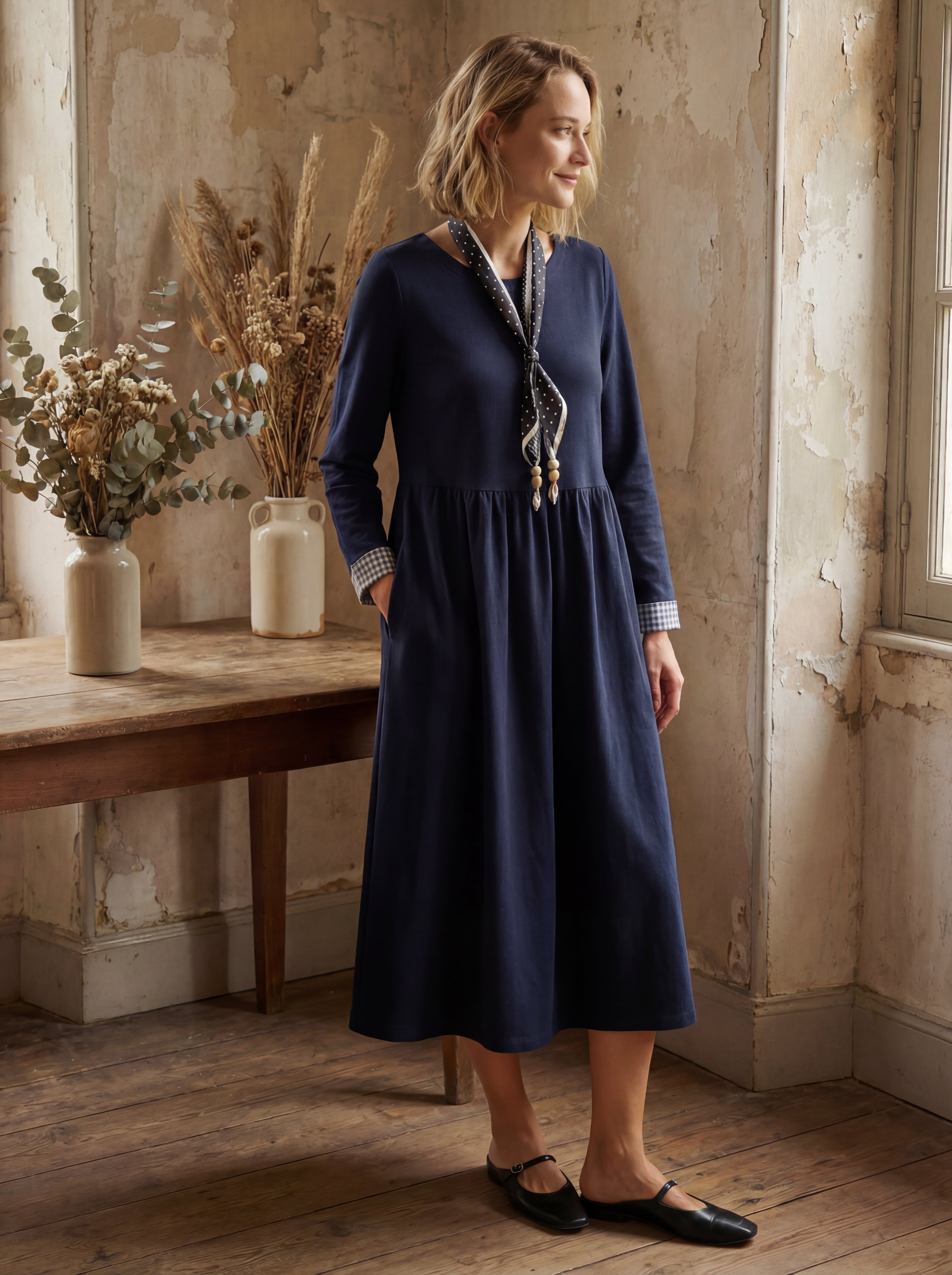 Robe longue décontractée à col rond et poignets patchwork en coton biologique SCARLETT