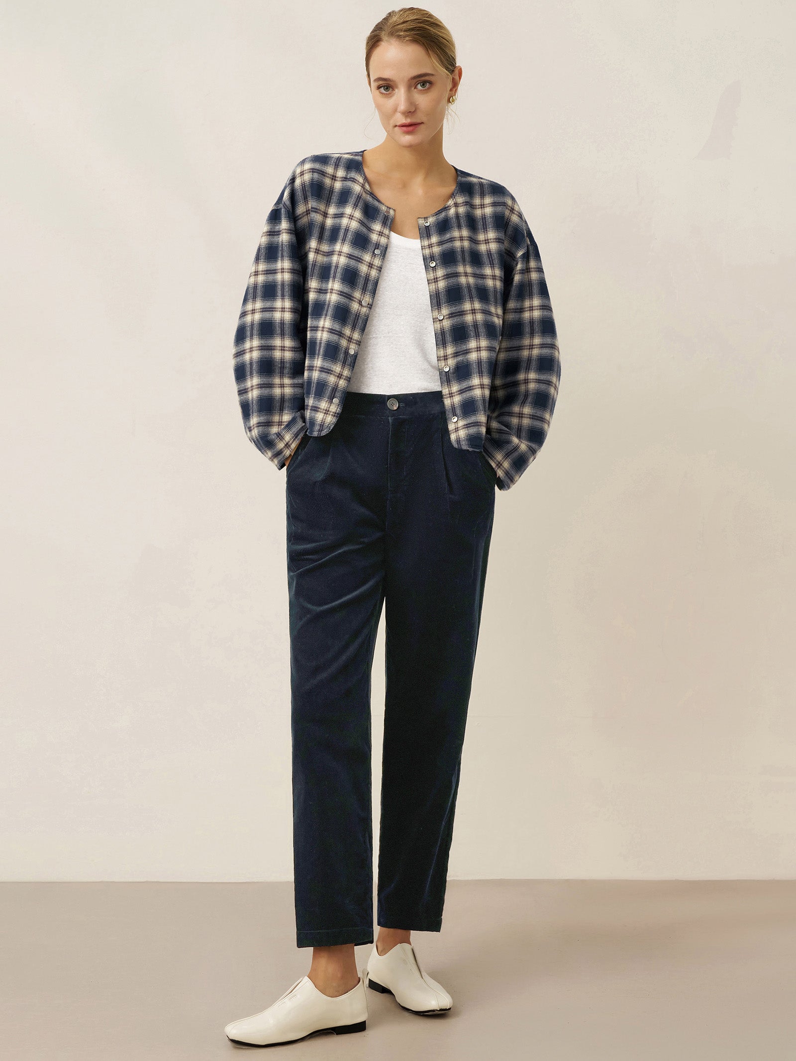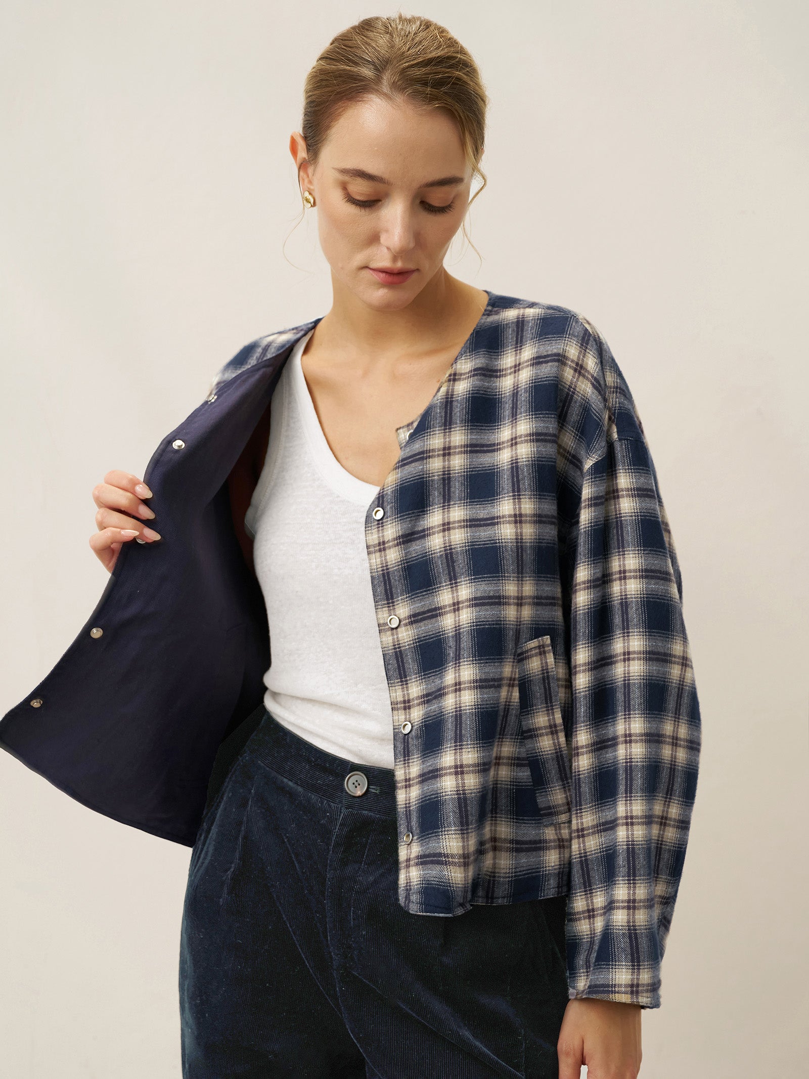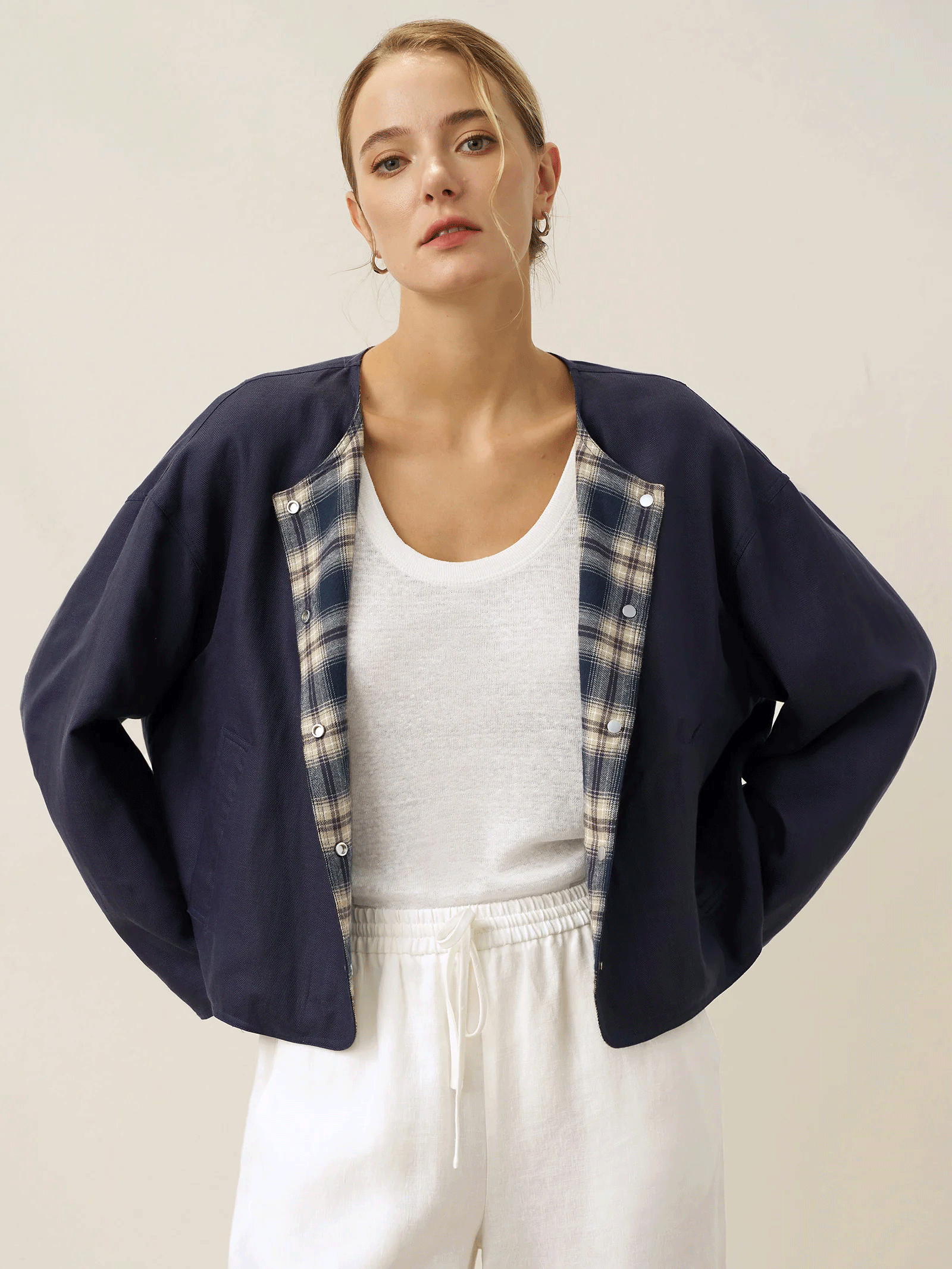 Une veste réversible à col rond confectionnée dans un tissu à carreaux en Tencel, lin et coton, conçue pour un style polyvalent avec des détails ajustables et un confort décontracté en Bleu Crépuscule.