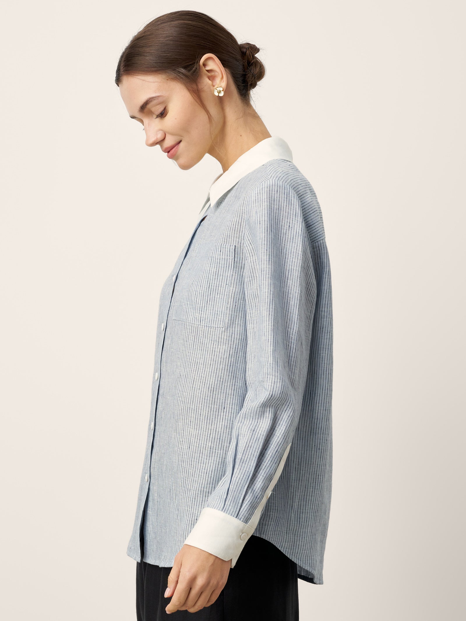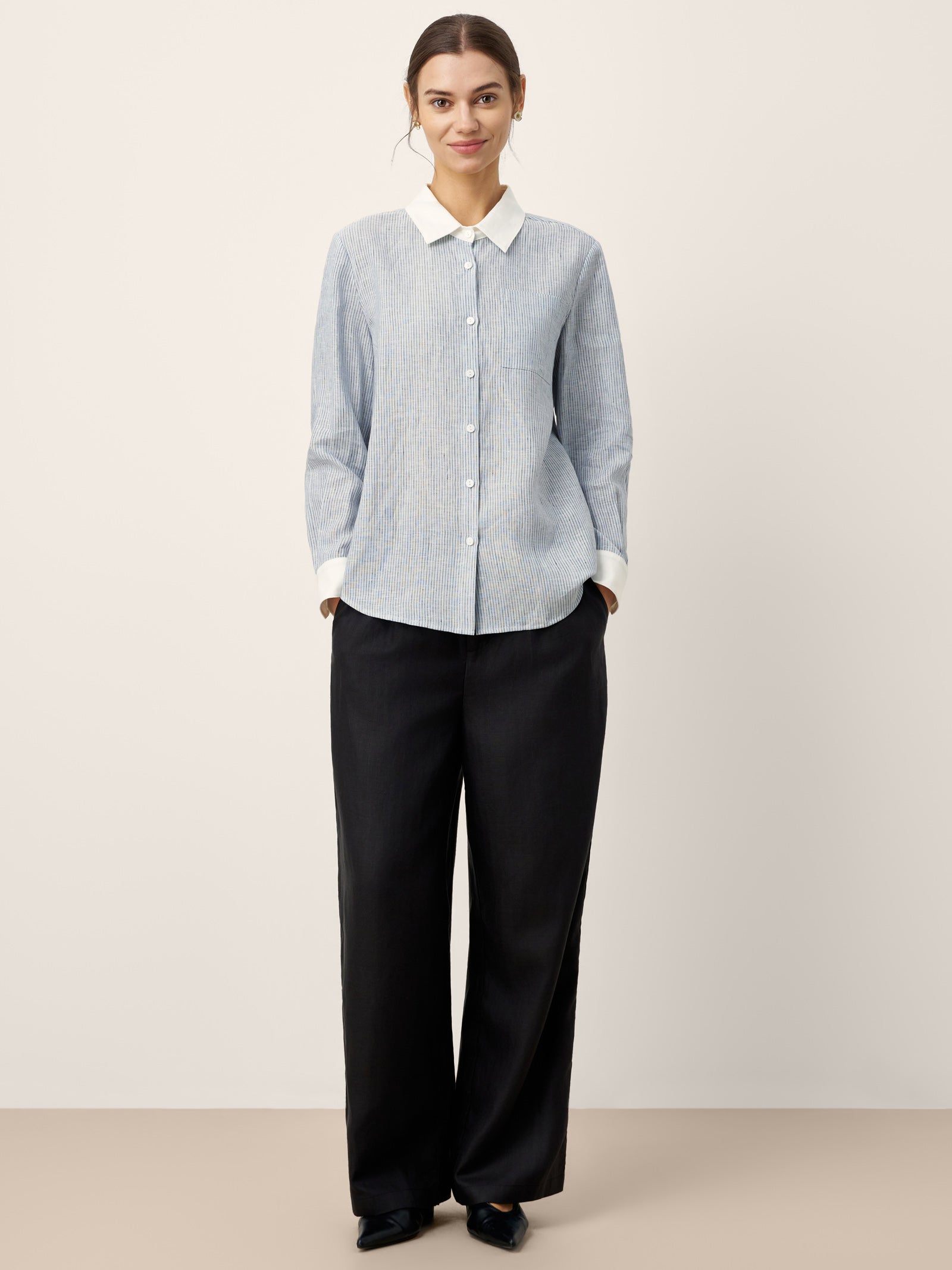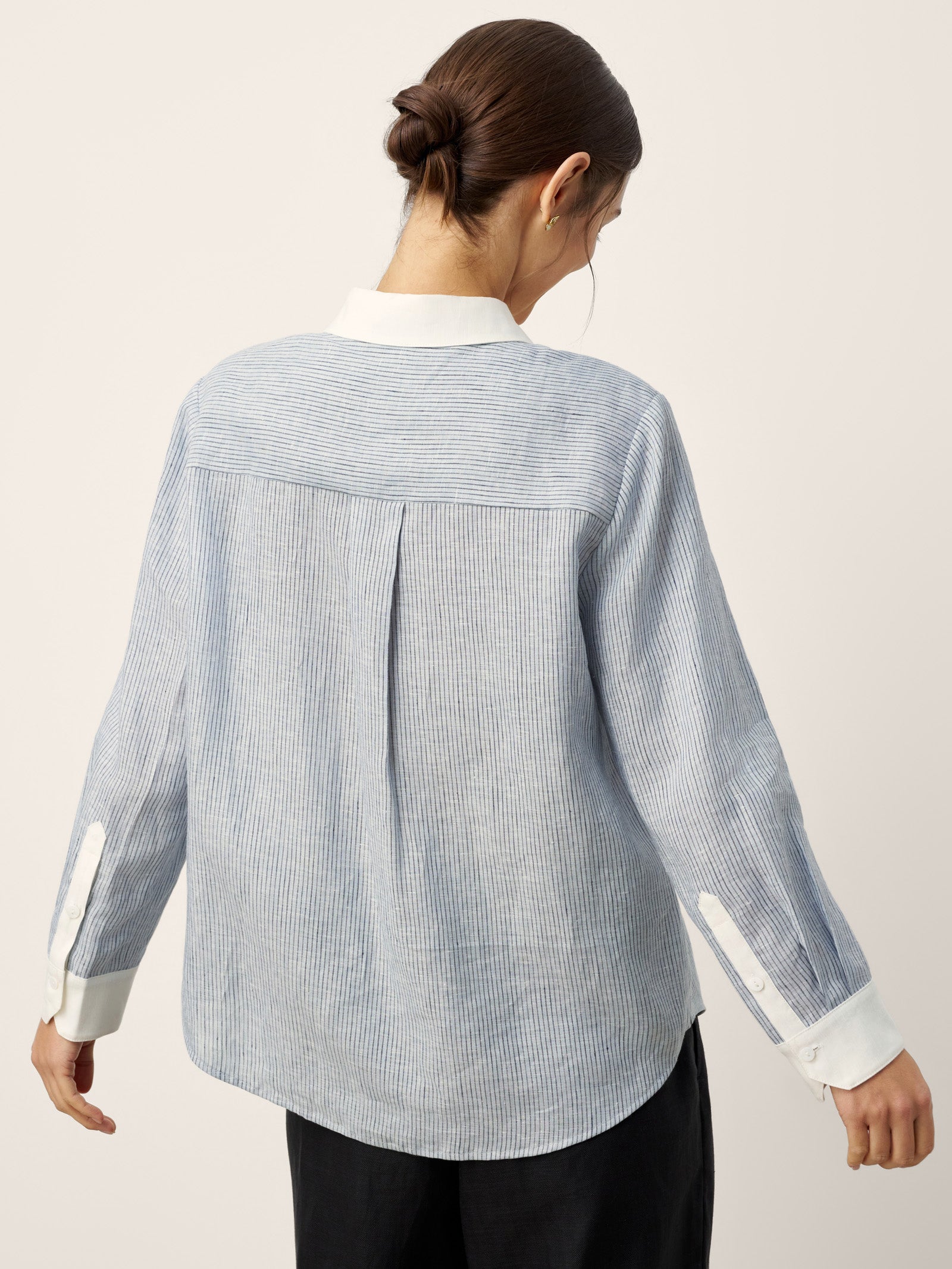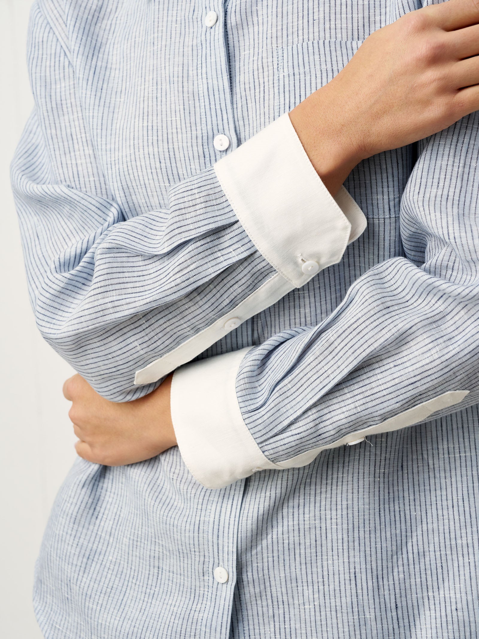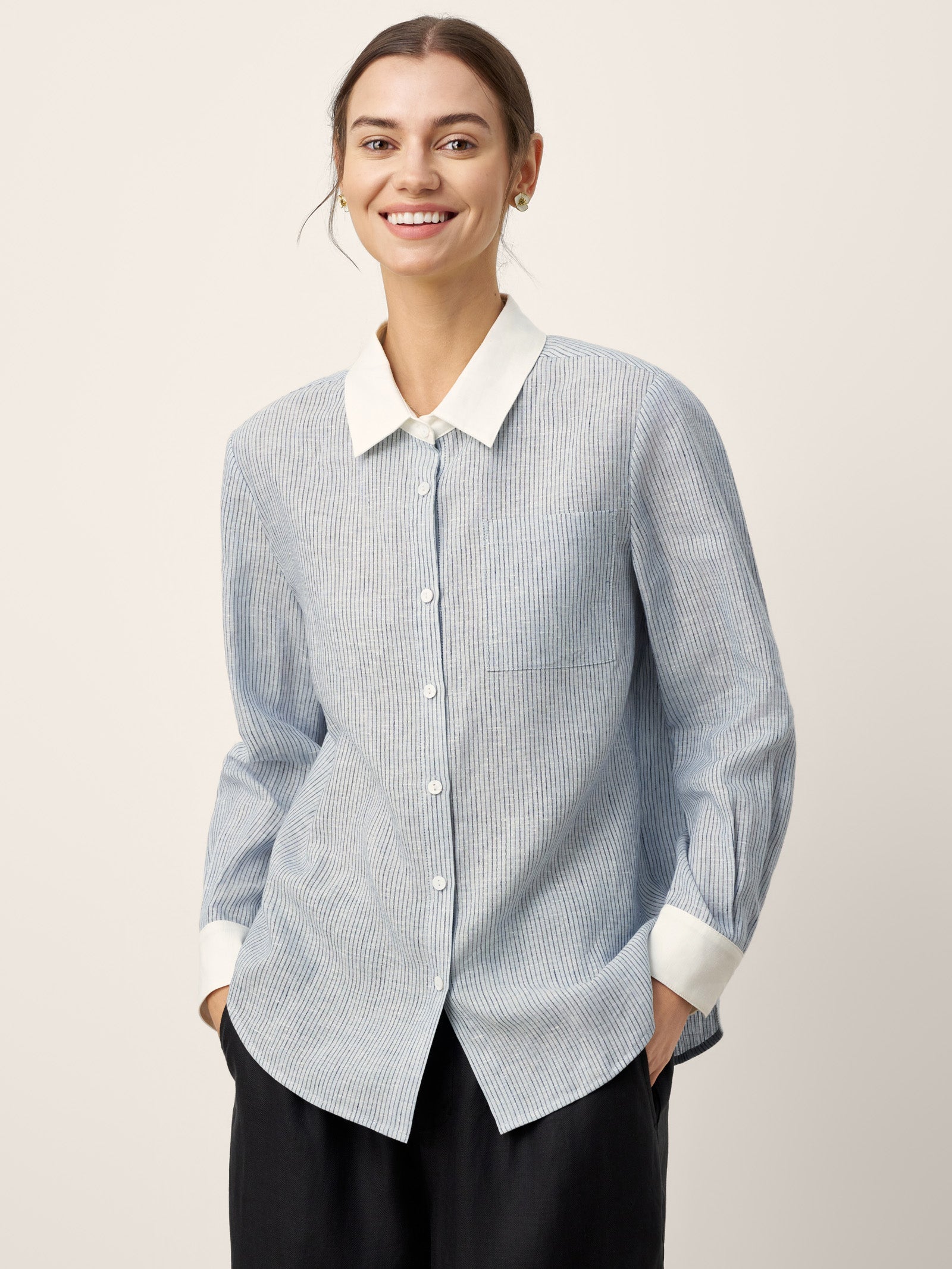 - Col & Poignets Contrastés : Les détails d'un blanc pur tranchent nettement avec le tissu rayé, amplifiant la profondeur visuelle tout en projetant un professionnalisme soigné.