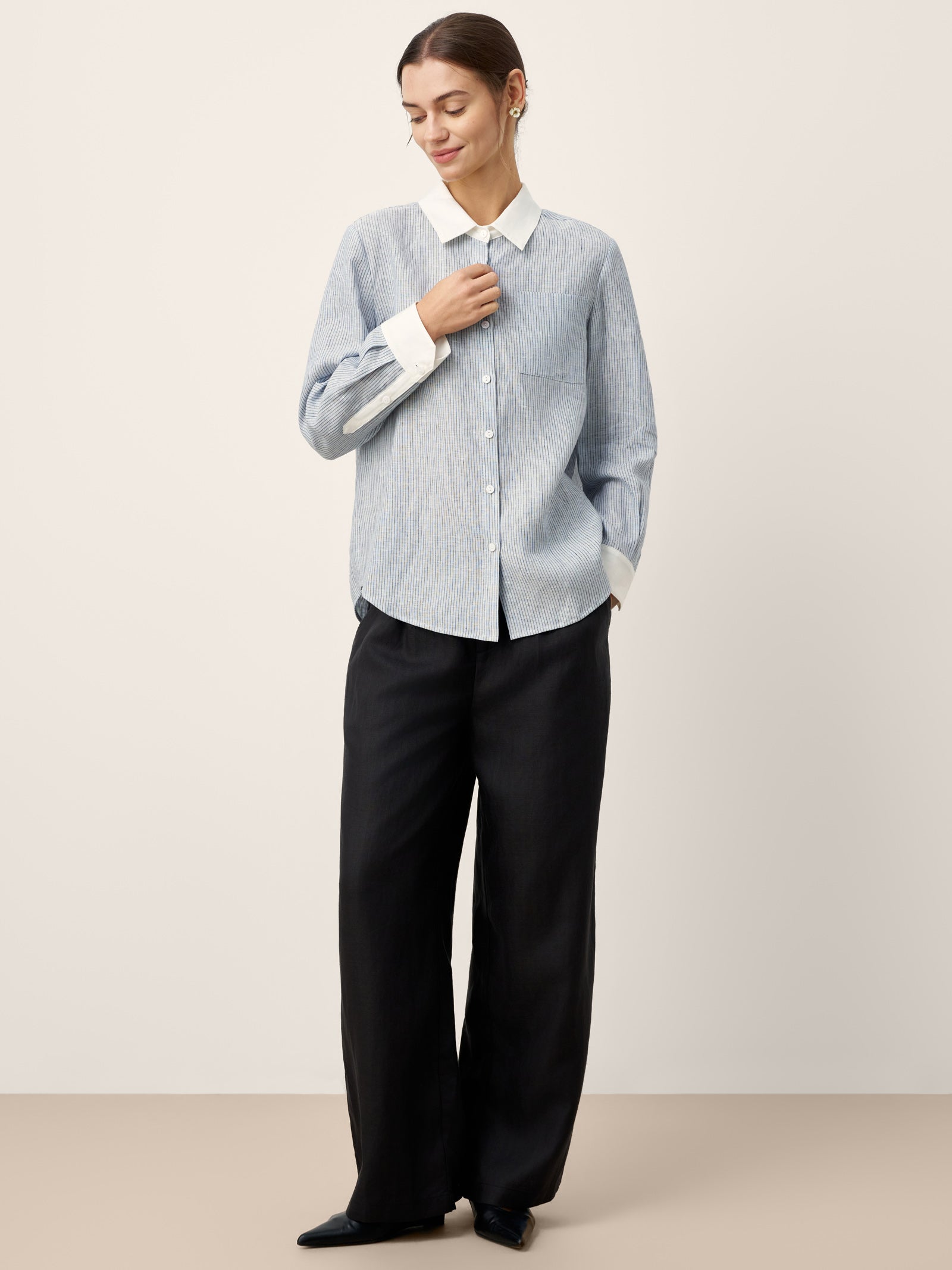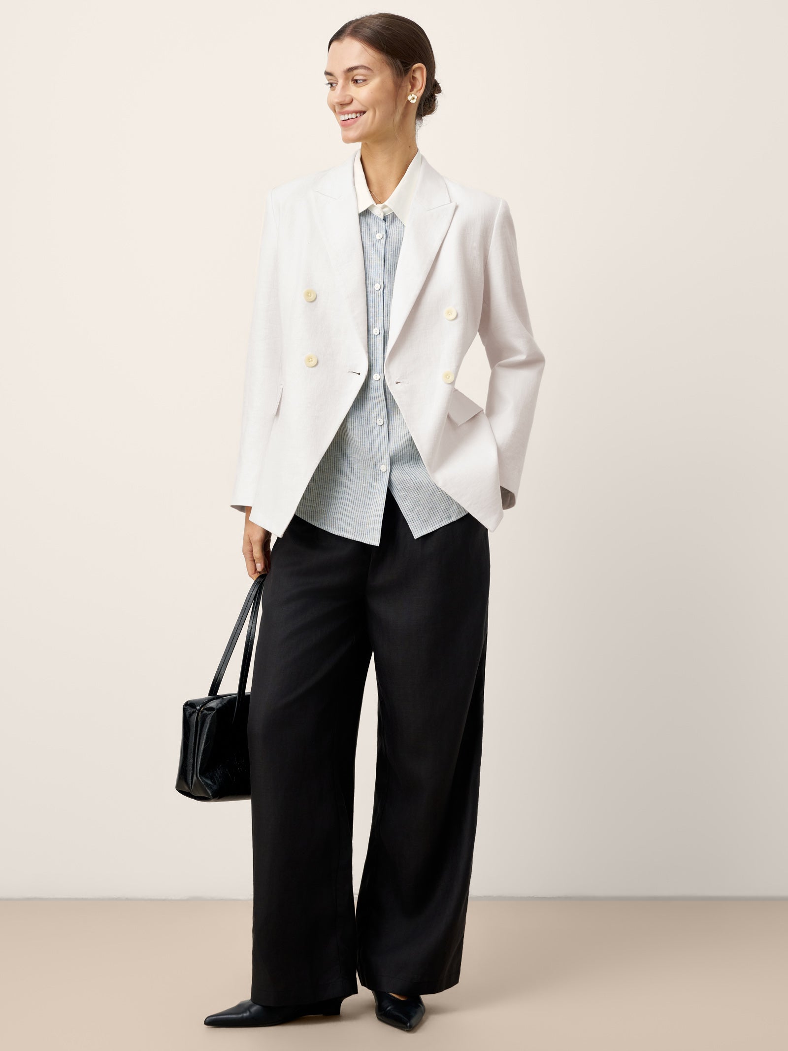 - Minimaliste Corporate : À porter avec un pantalon fuselé + des chaussures plates à bout pointu