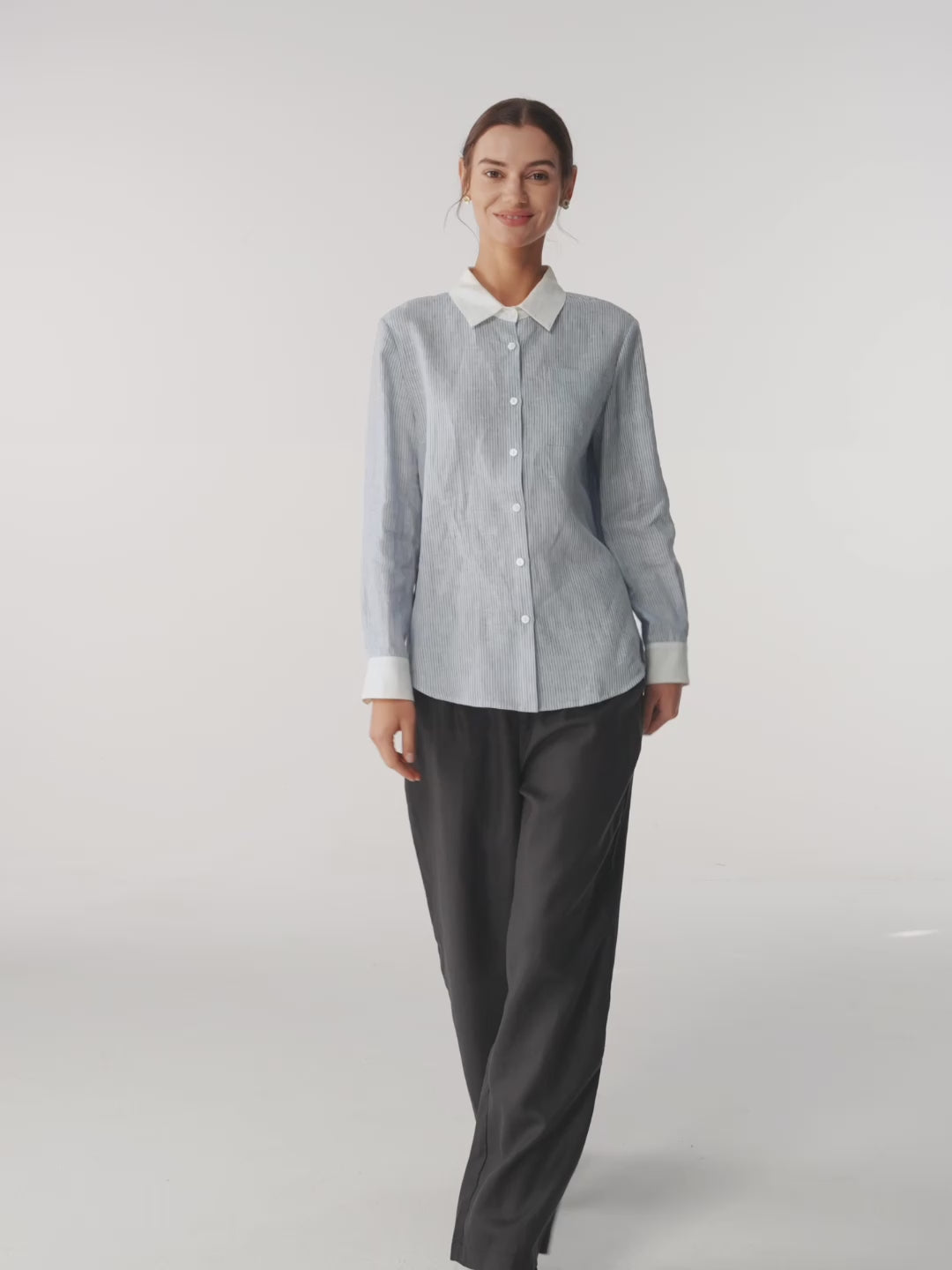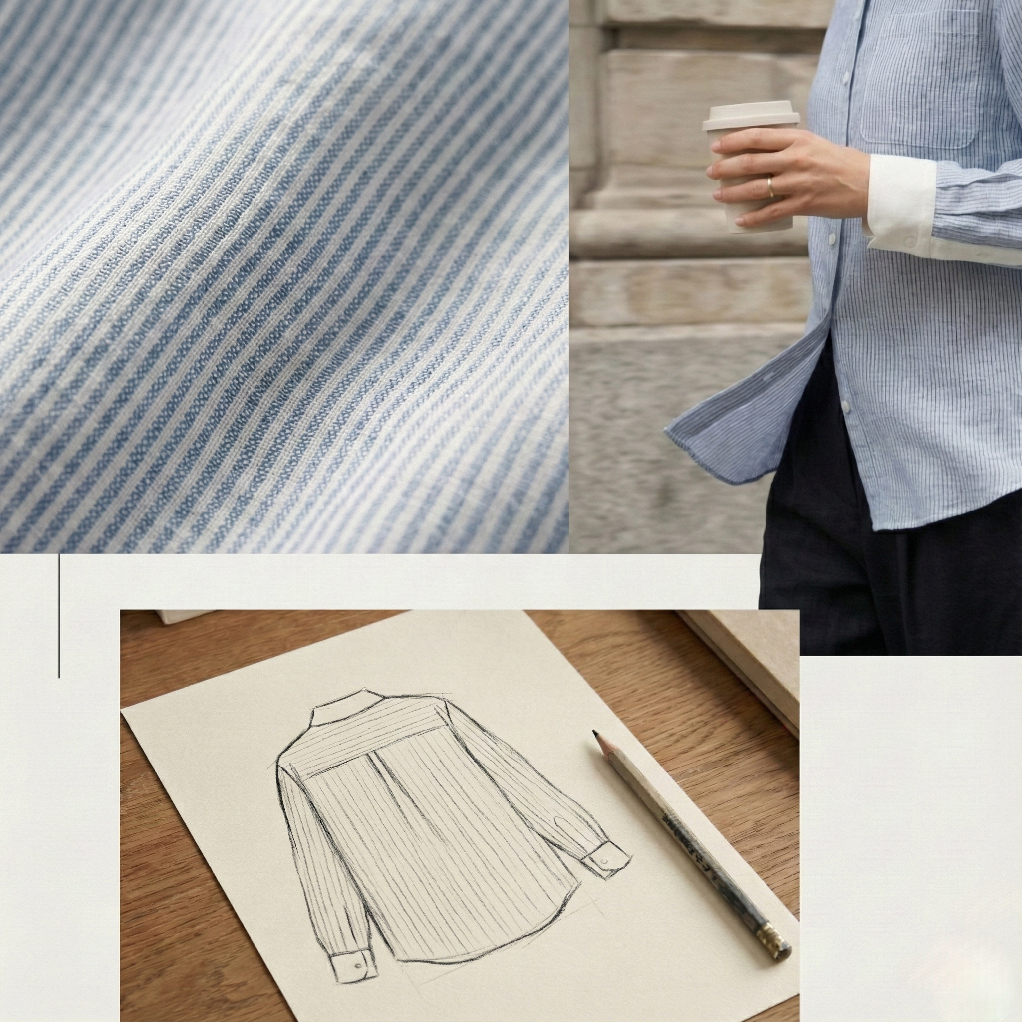 Les fines rayures bleu gris et bleu clair apportent une lecture nette sans rigidité. Une palette pensée pour les contextes professionnels, où la clarté compte autant que la douceur.