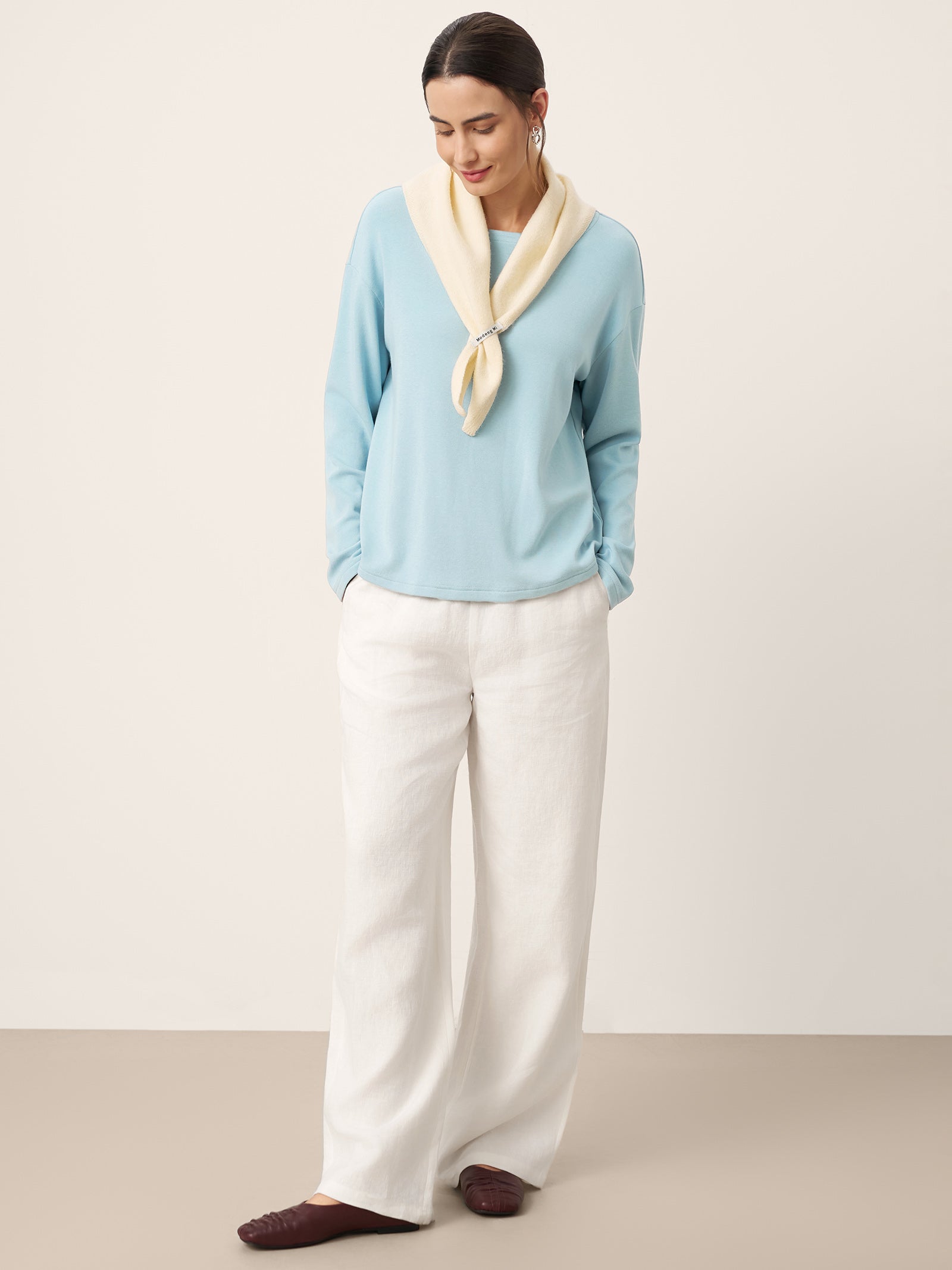 Un mélange soigneusement équilibré de fibres haut de gamme — cachemire, TENCEL™ et modal — crée un tissu aérien qui offre une sensation douce, lisse et parfaitement naturelle sur la peau.