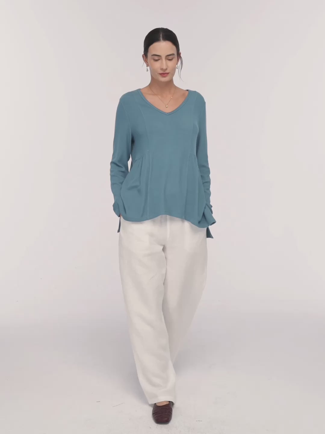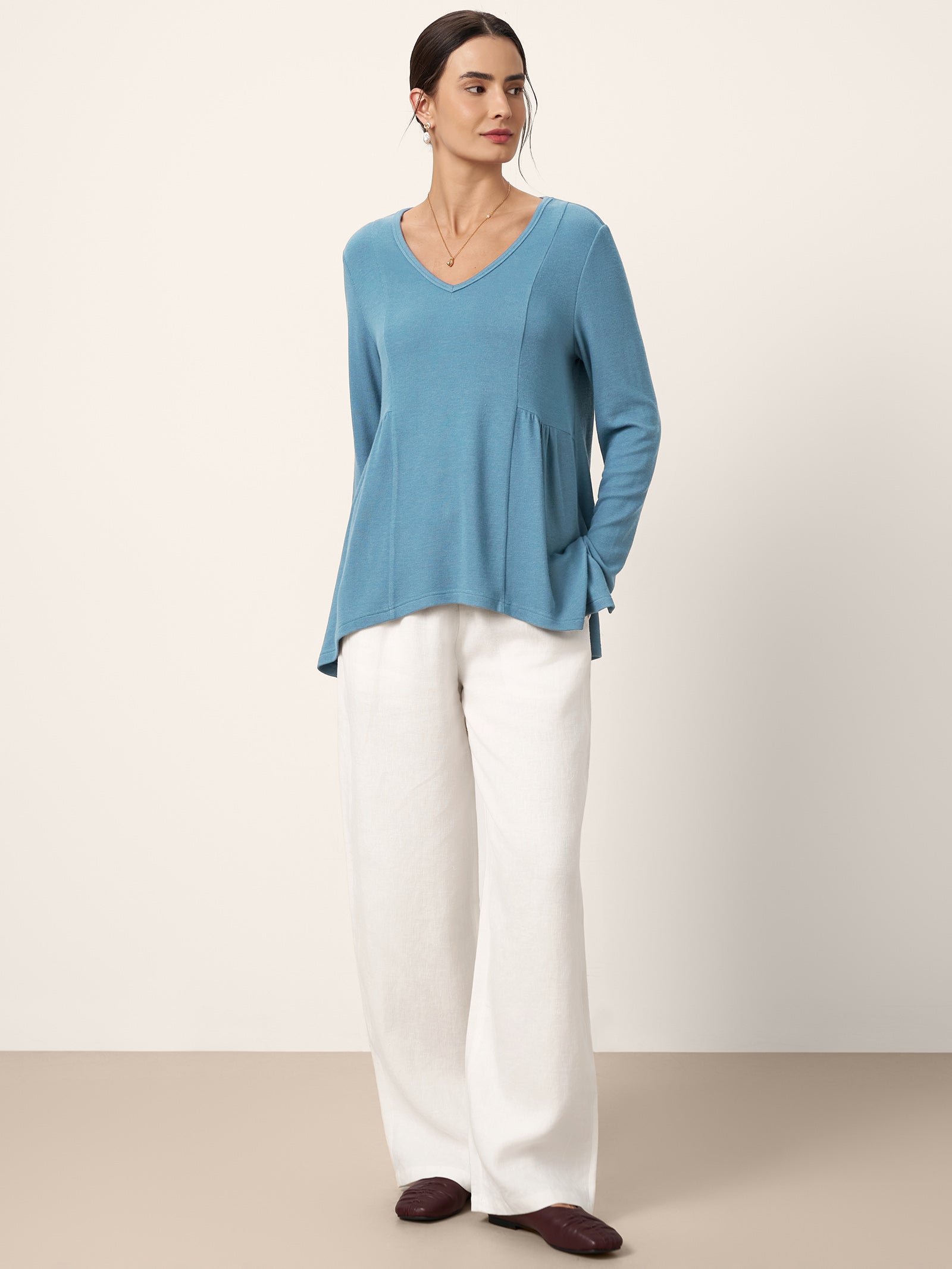 Un mélange soigneusement équilibré de fibres haut de gamme — cachemire, TENCEL™ et modal — crée un tissu aérien qui offre une sensation douce, lisse et parfaitement naturelle sur la peau.