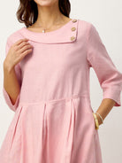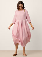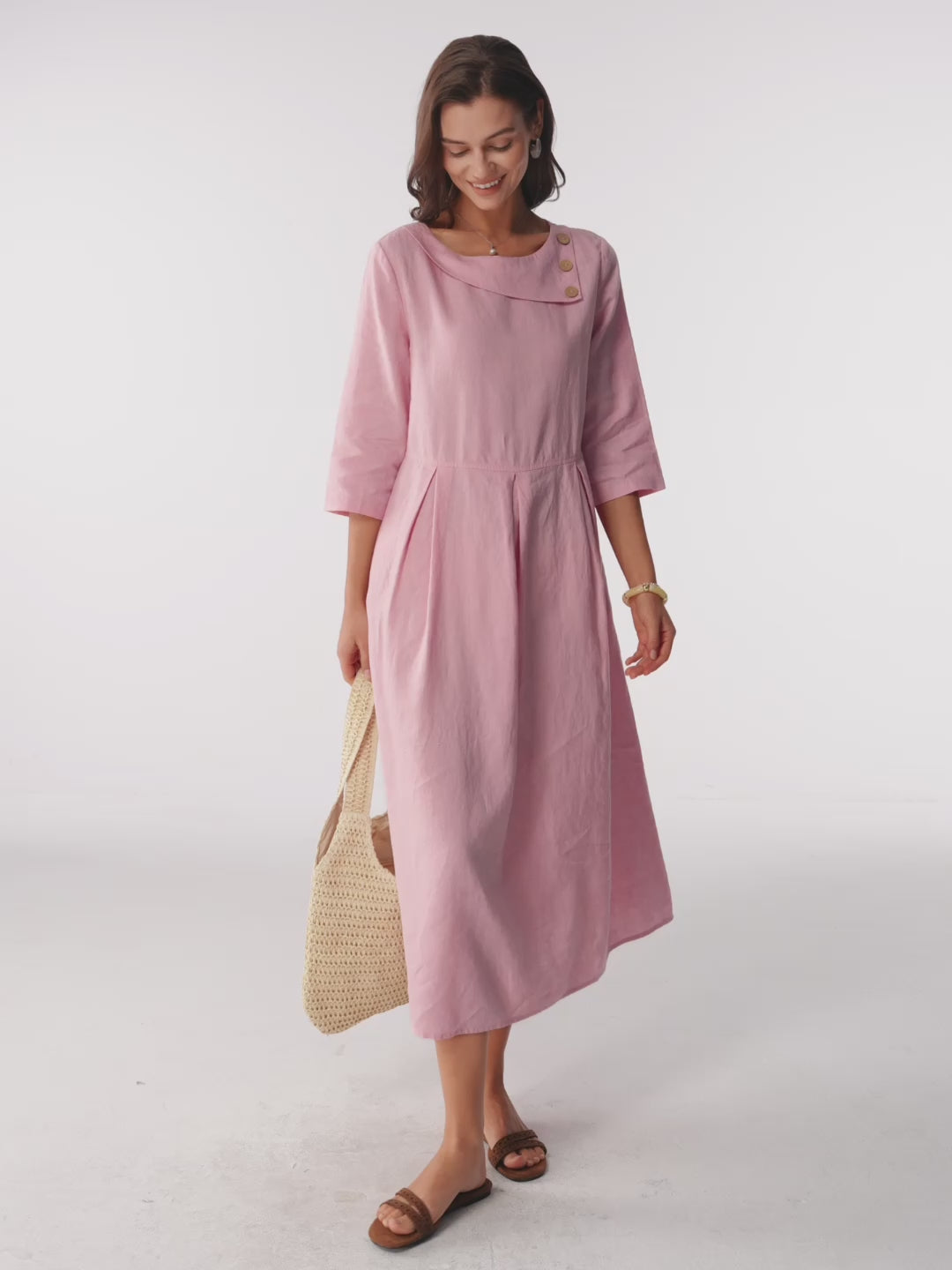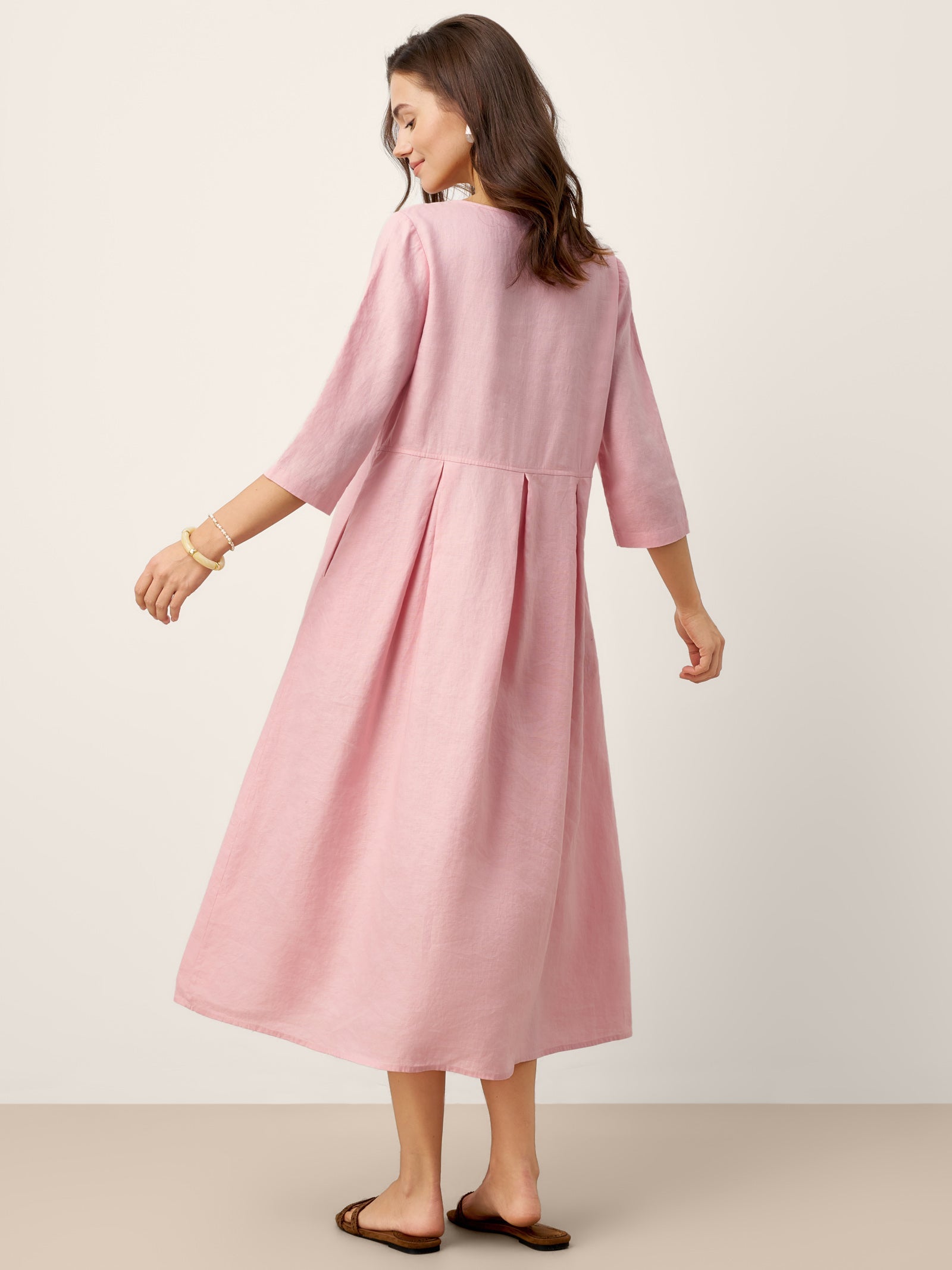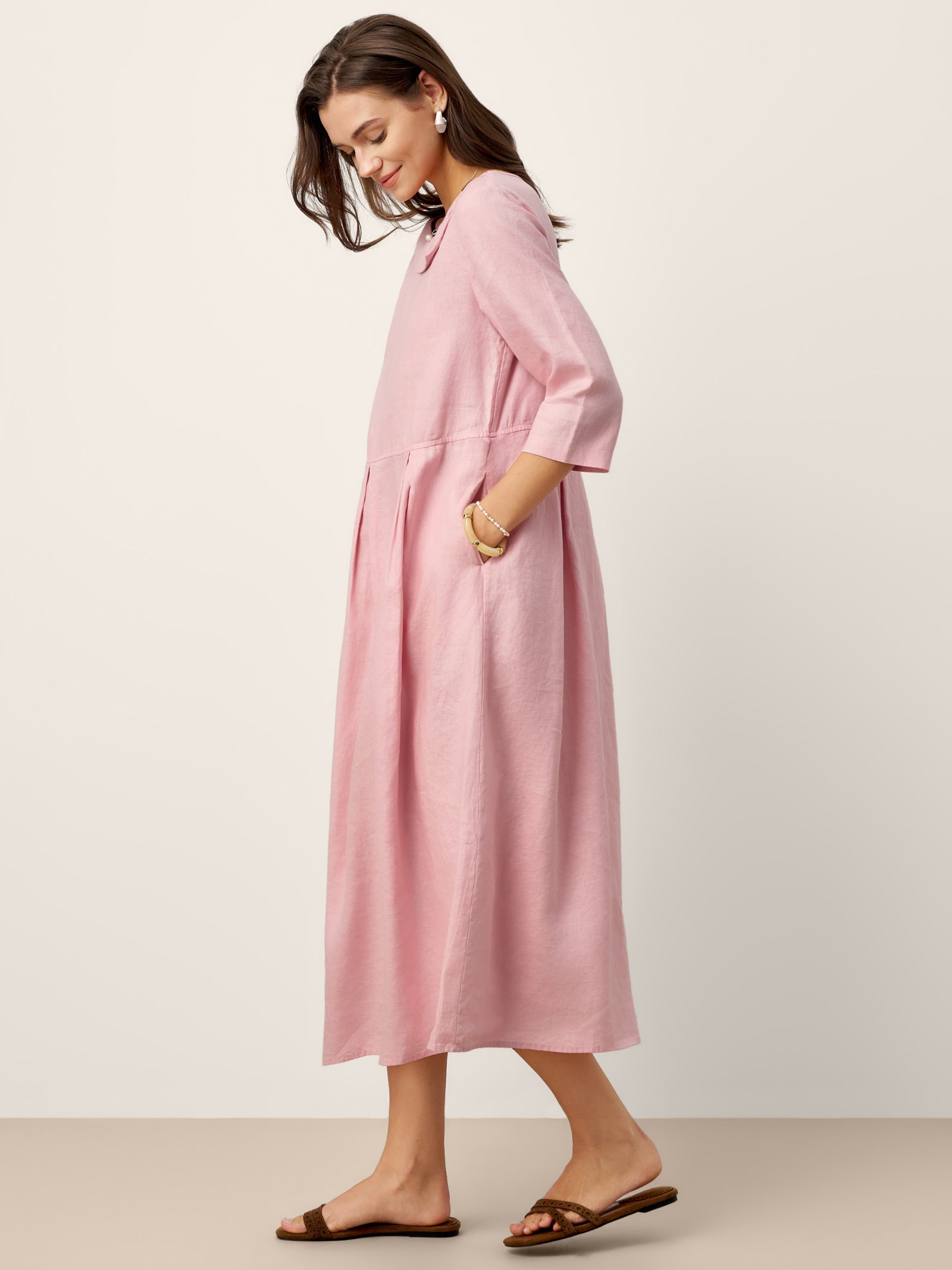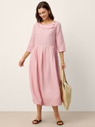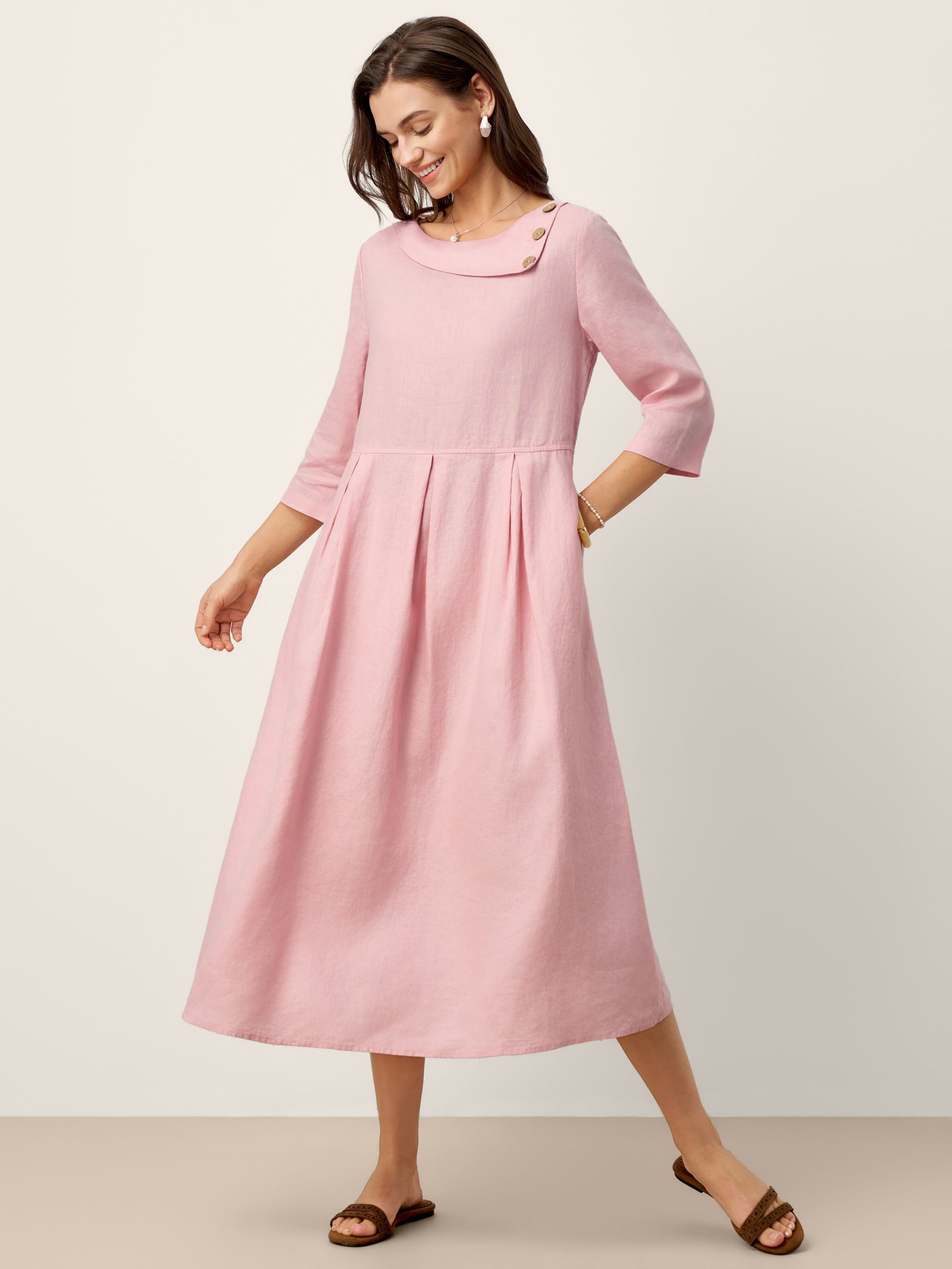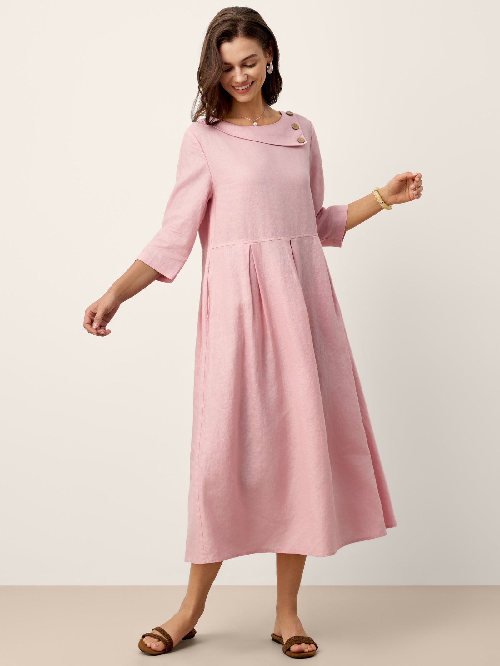 Robe longue en lin 100 % à col croissant avec boutons décoratifs et taille plissée GWENYTH
