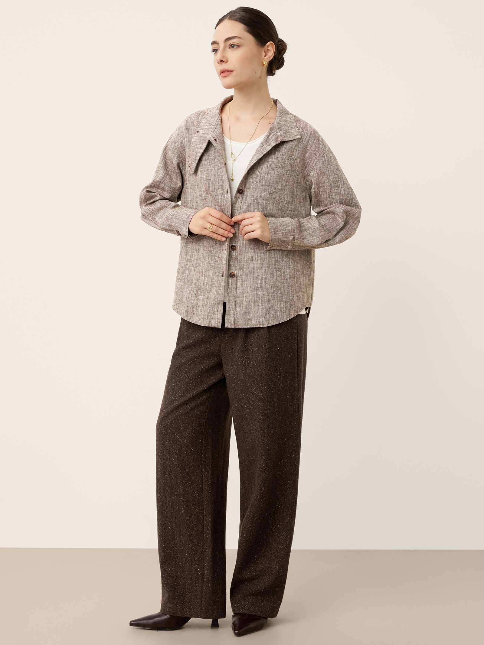 - Minimaliste Urbaine: Rentrez-la dans un pantalon noir ajusté, ajoutez des créoles dorées et terminez avec des mules en cuir pour une allure digne d'une galerie.
