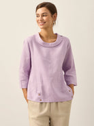 Cette blouse associe un drapé doux et des détails artisanaux : le col souplement drapé encadre gracieusement le décolleté, tandis que les manches trois-quarts ajoutent une touche de sophistication décontractée. Les boutons délicatement travaillés apportent une subtile note de luxe à chaque tenue.