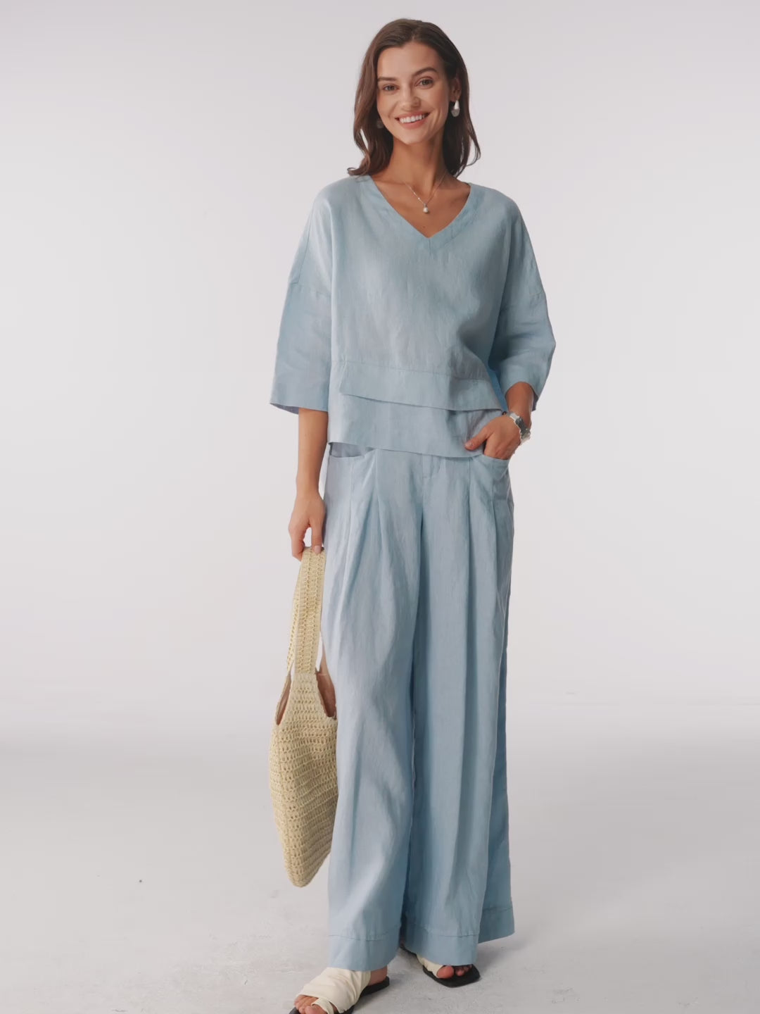 Les hauts fluides en lin VIOLA présentent des superpositions asymétriques en cascade et une silhouette décontractée à épaules tombantes, combinant un design structuré avec un confort respirant pour un usage quotidien polyvalent.