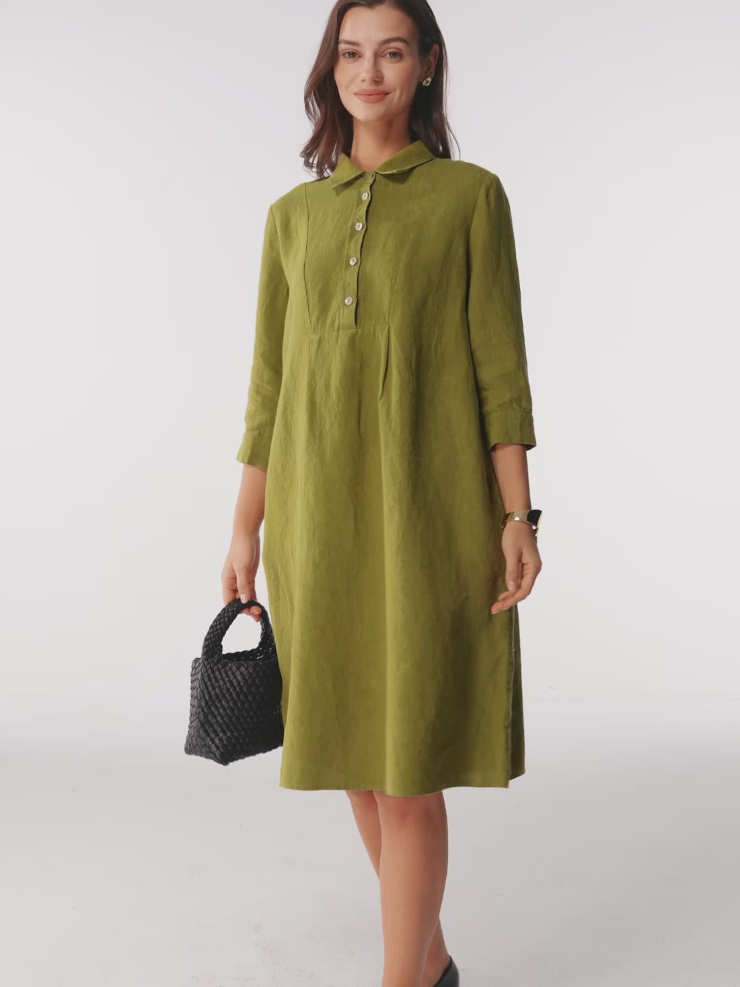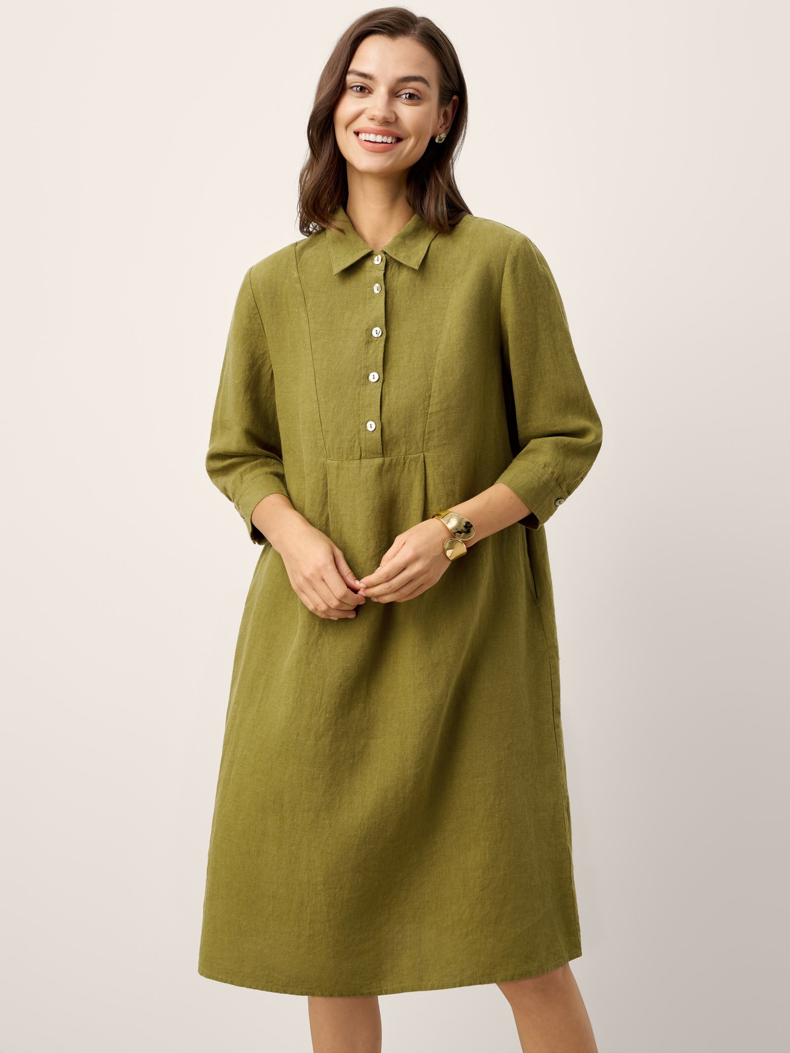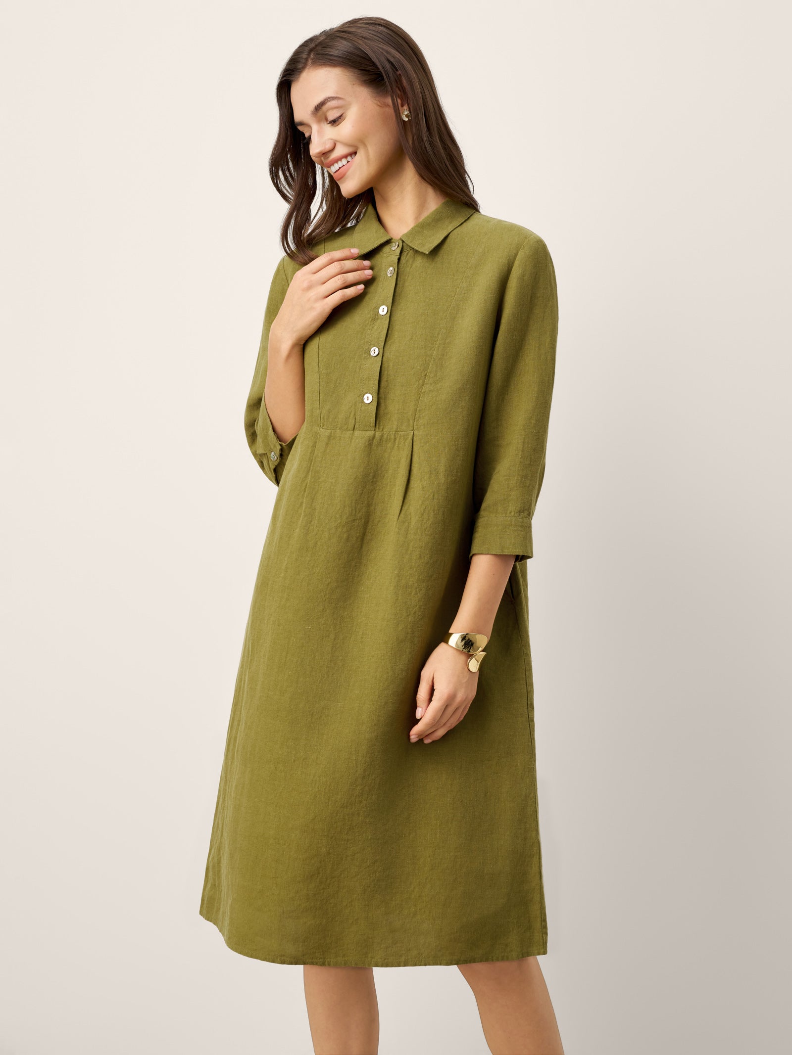Cette robe midi en lin allie texture naturelle et détails raffinés : des boutons en nacre et un col net soulignent l'encolure, tandis que des plis creux sur le devant et un froncé au dos créent un mouvement gracieux et aéré.