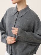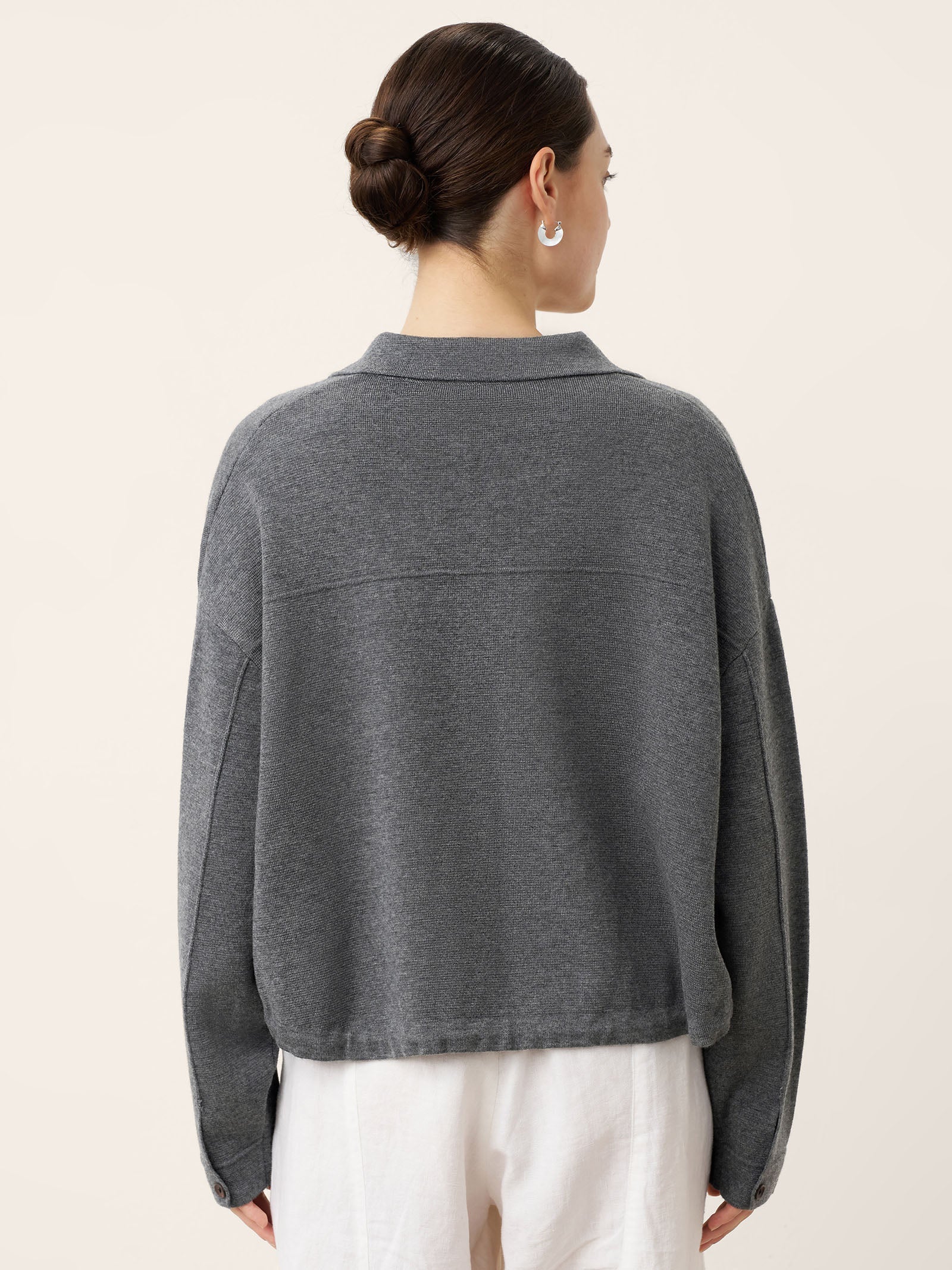 - Col Hybride Poli: Le col classique de chemise et la patte de boutonnage allient une coupe sophistiquée au confort du tricot pour une allure soignée et polyvalente.