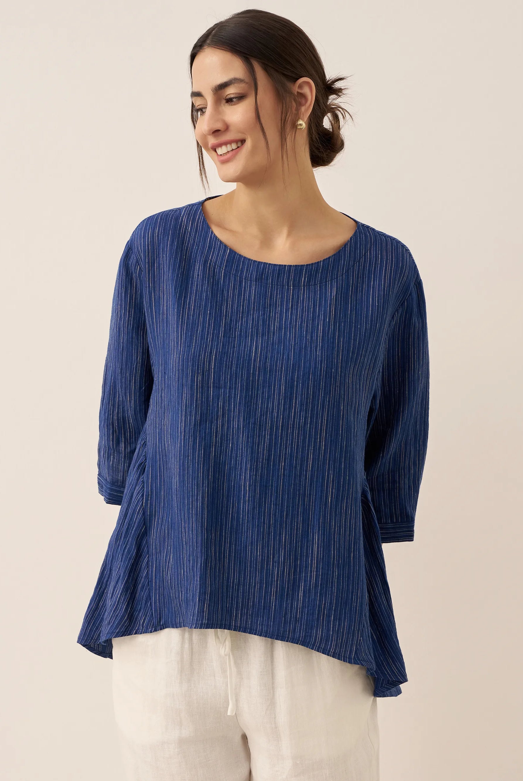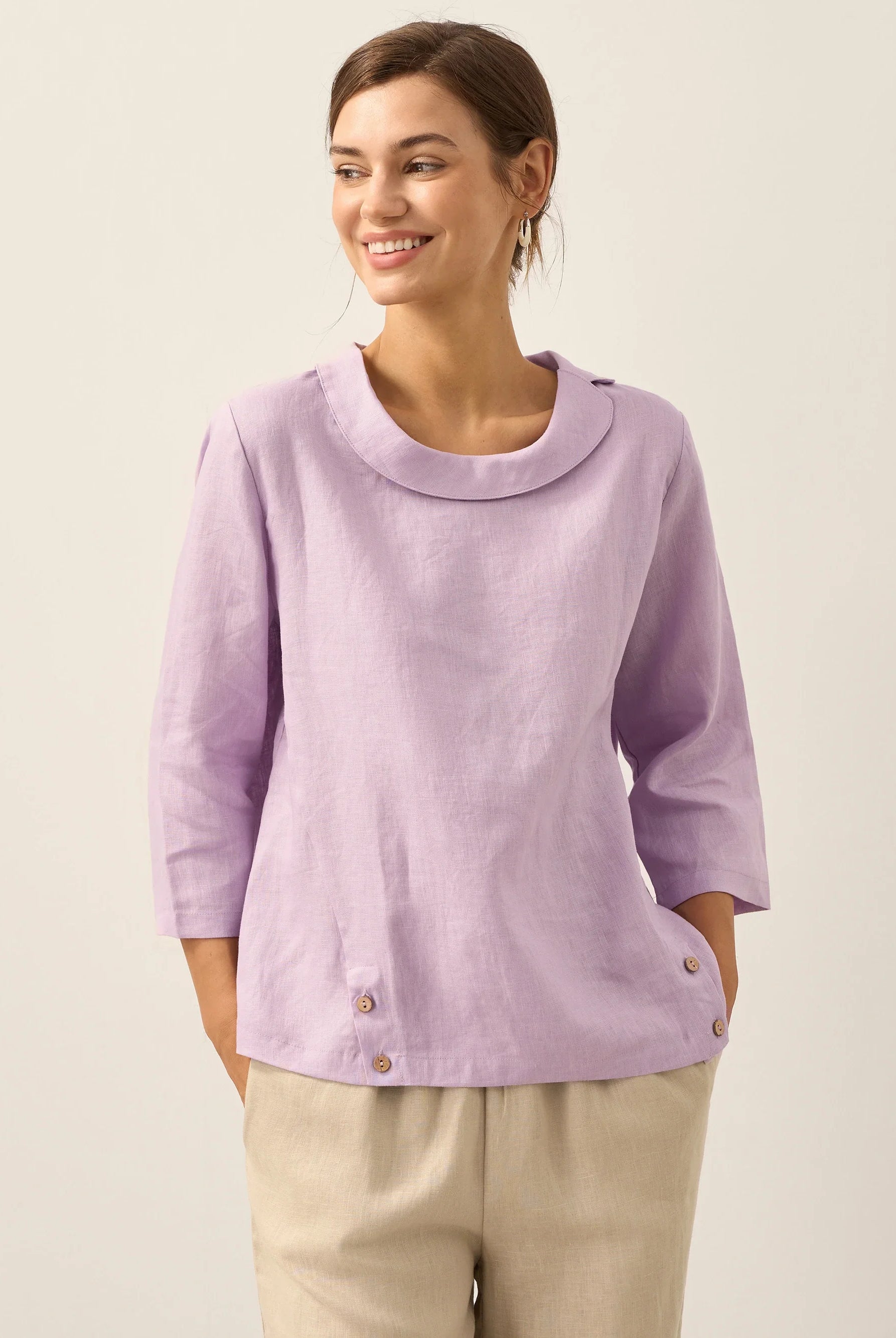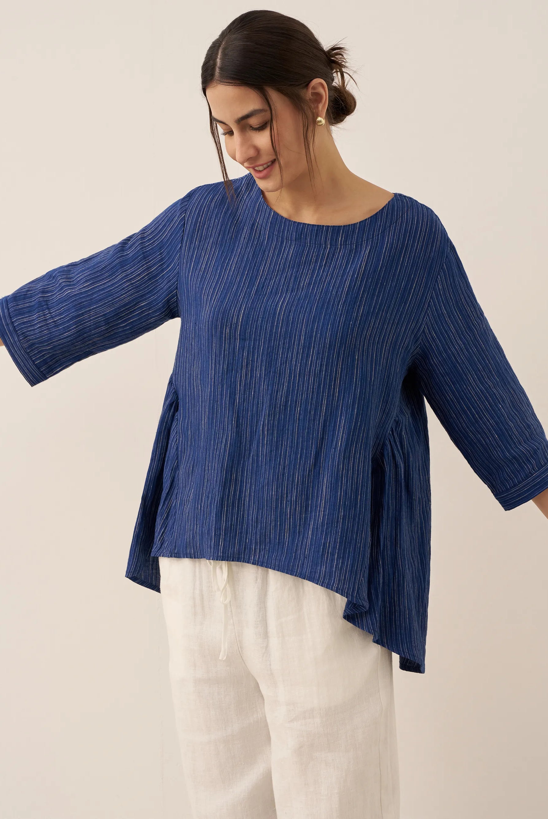The Briony asymmetric side-ruched top is so flattering! The stretch fabric and ruching give a nice cinched-waist effect that really enhances the figure. Im wearing a size M and the fit is perfect.