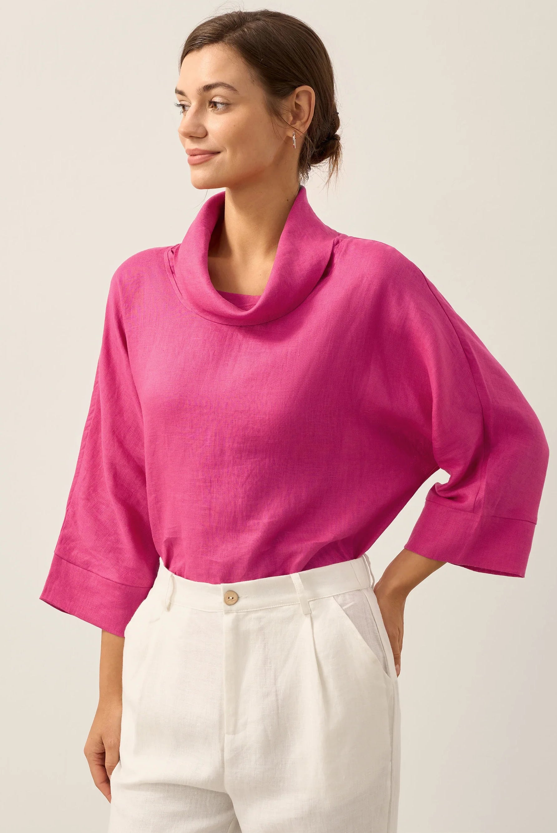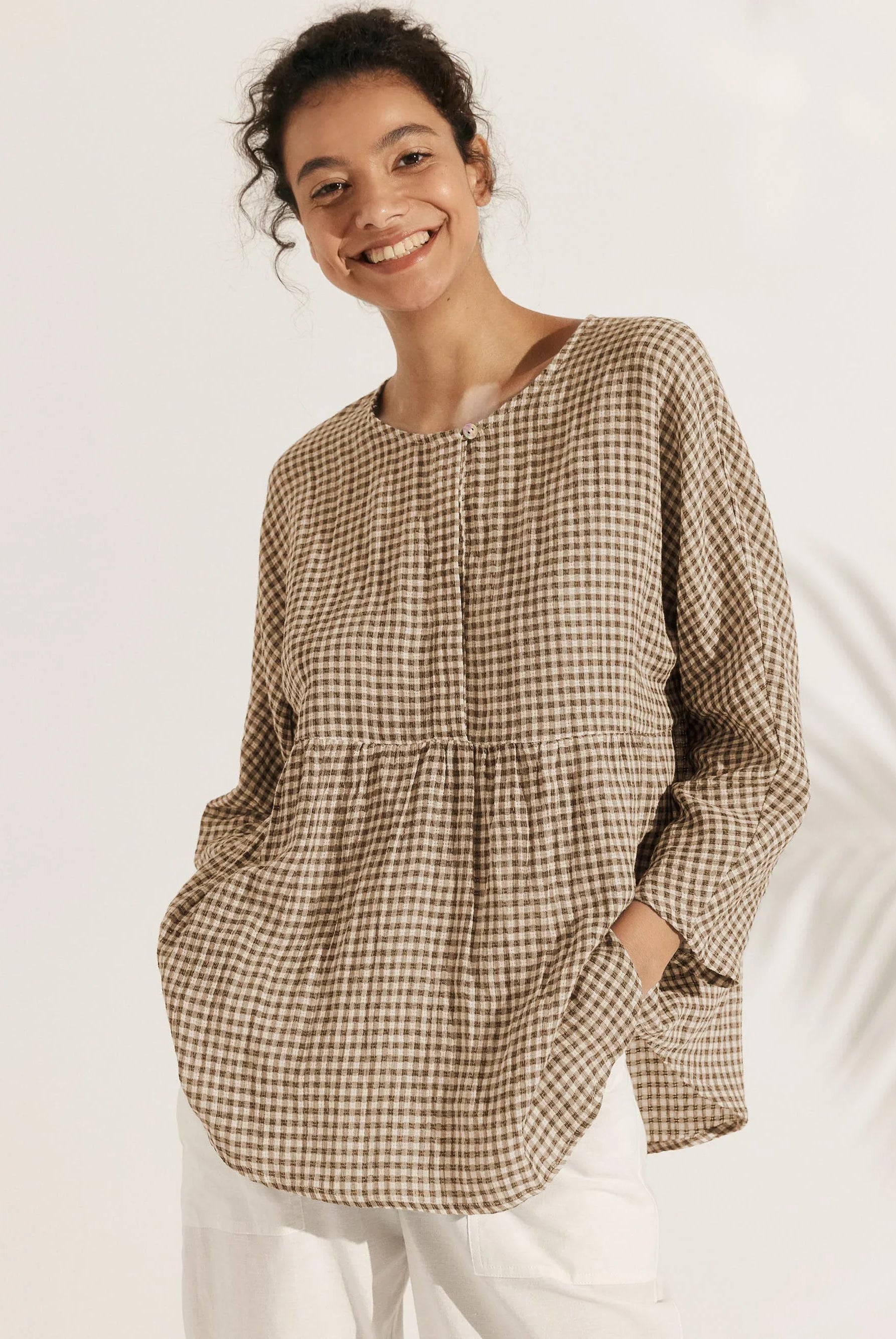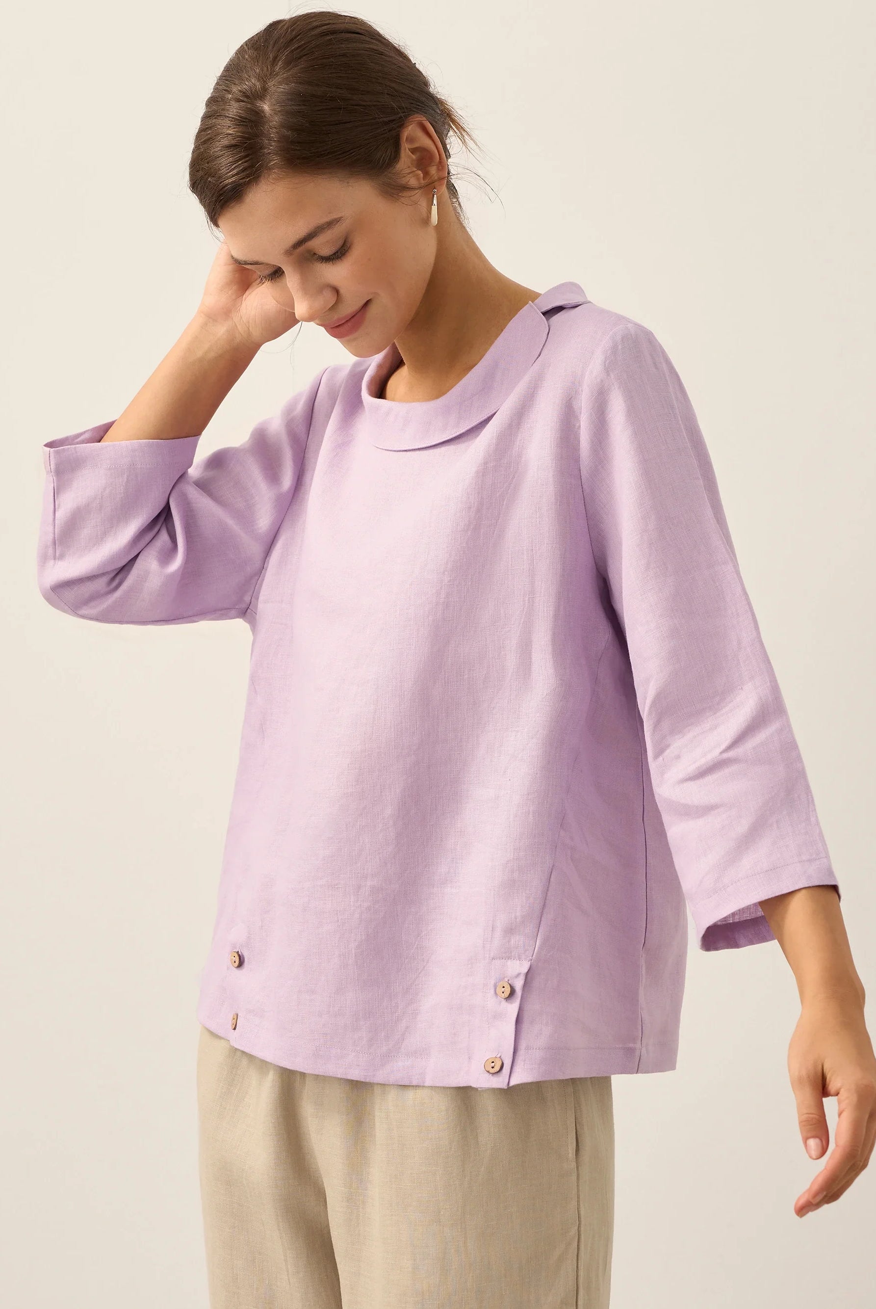 The Briony asymmetric side-ruched top is so flattering! The stretch fabric and ruching give a nice cinched-waist effect that really enhances the figure. Im wearing a size M and the fit is perfect.