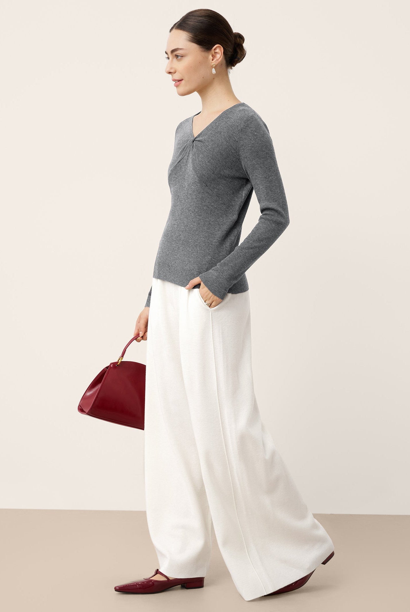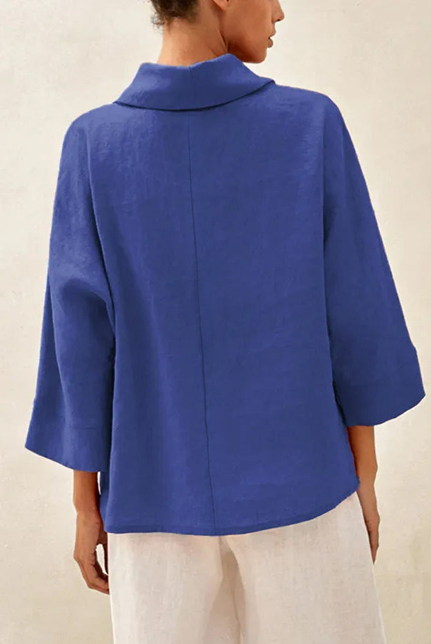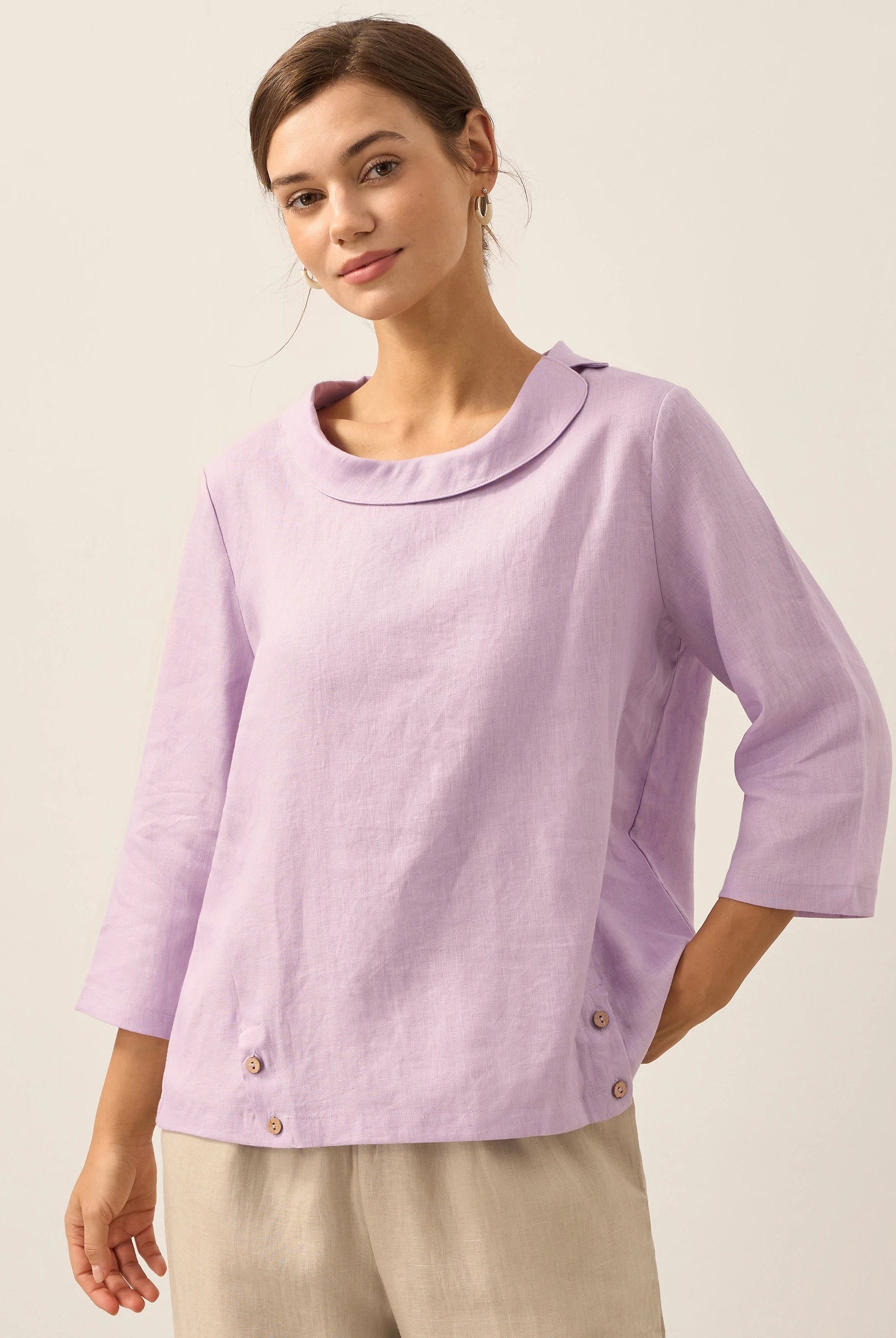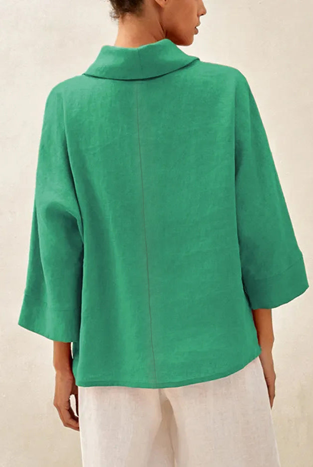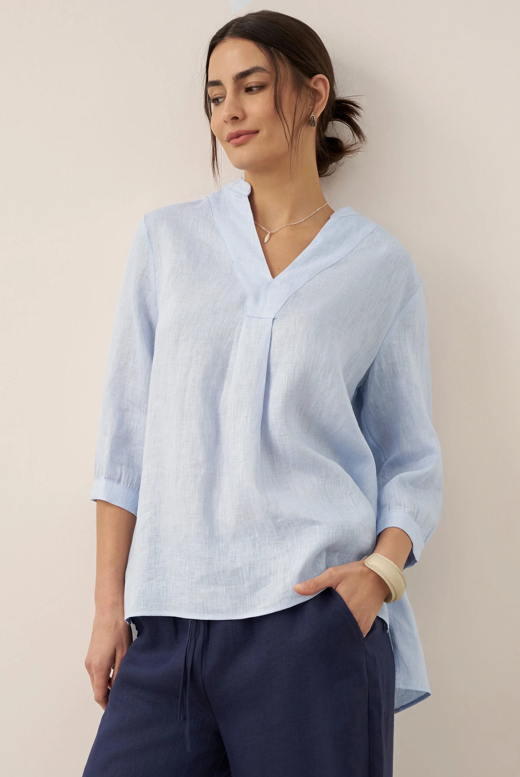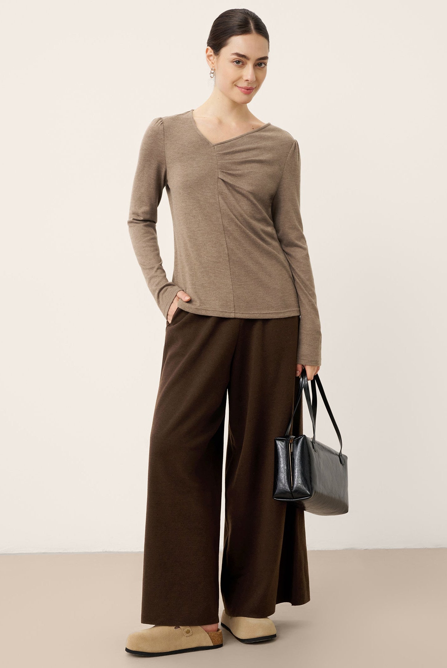 This wool-blend top is wrinkle-resistant, durable, and has seasonless temperature regulation. The notched collar V-neck adds a chic detail and the side ruching flatters the waist.