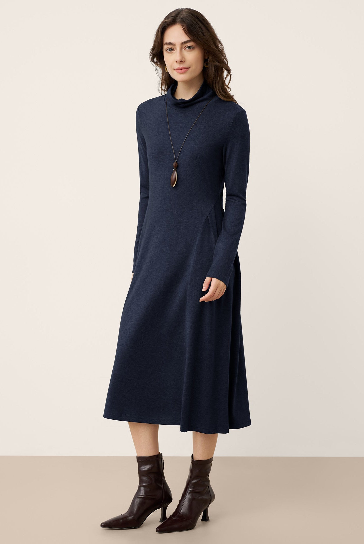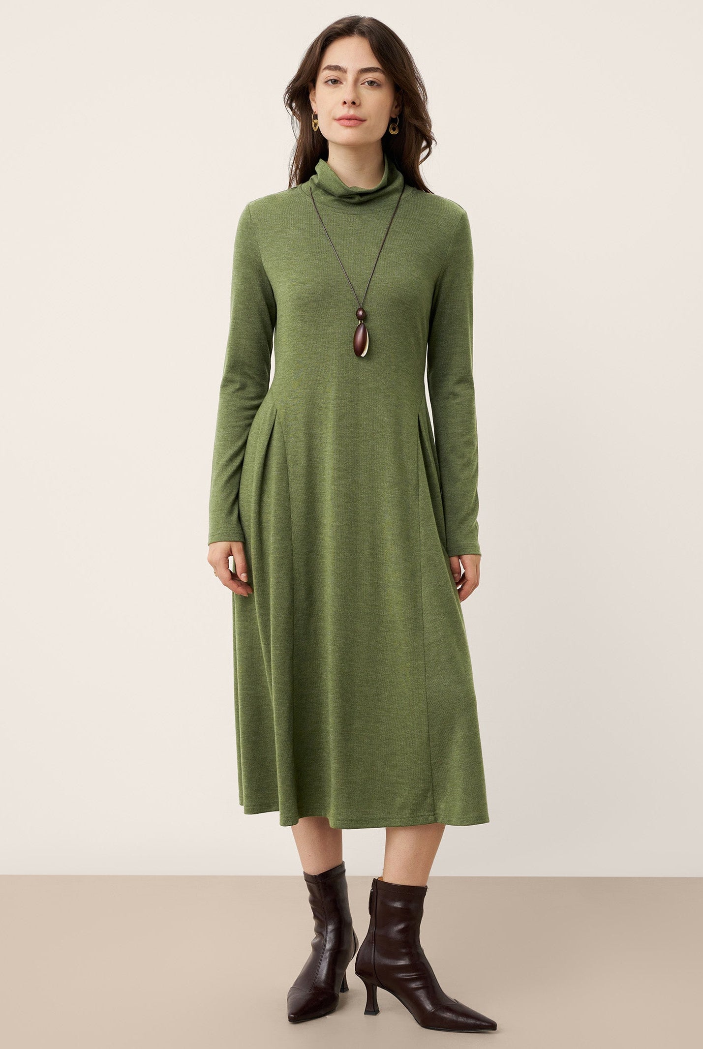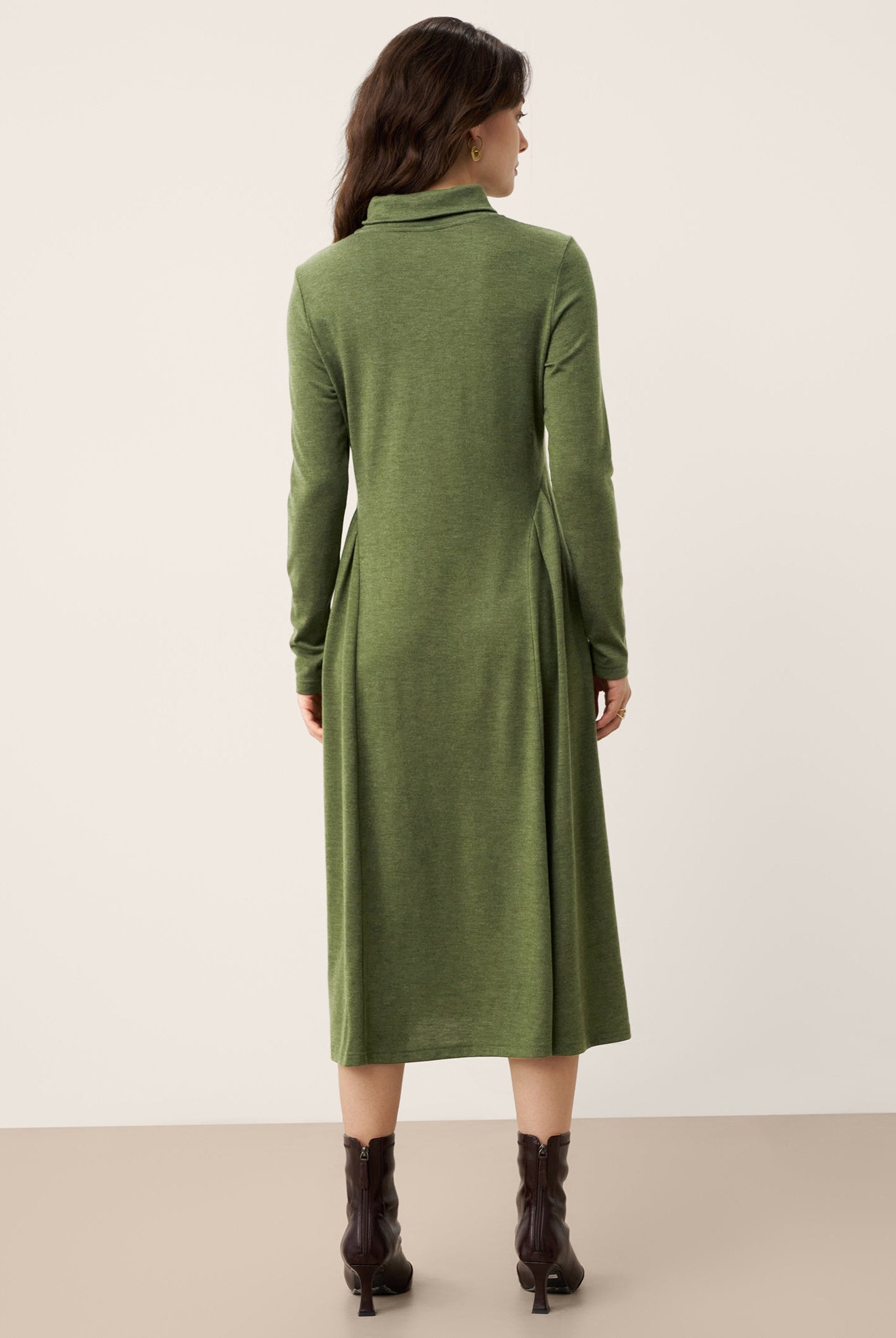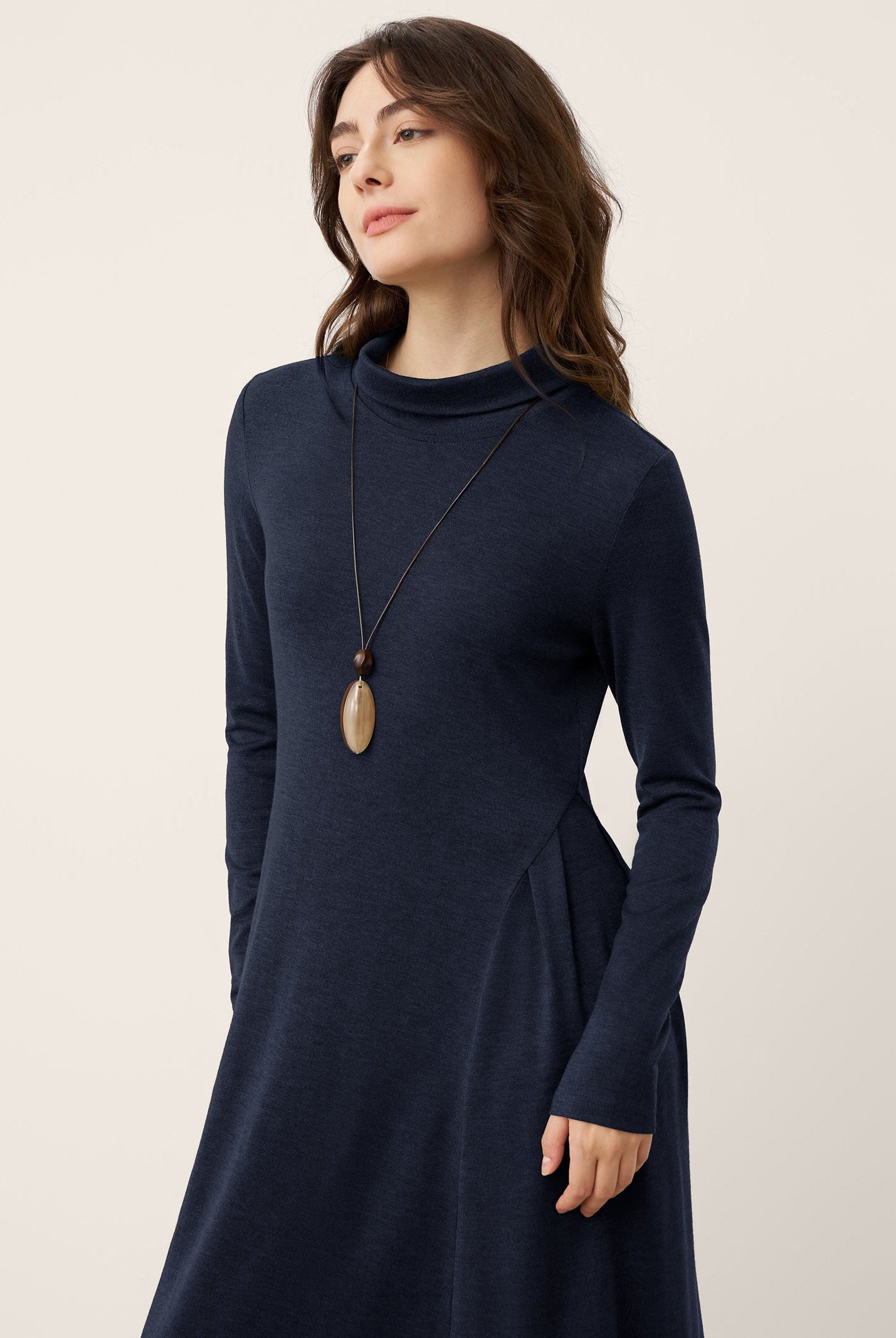 The wool turtleneck dress with sculpted pleats is a stunner. Soft fabric, perfect length, and the fit flatters so well. Got compliments all day at the office party. Worth every penny for fall and winter days.