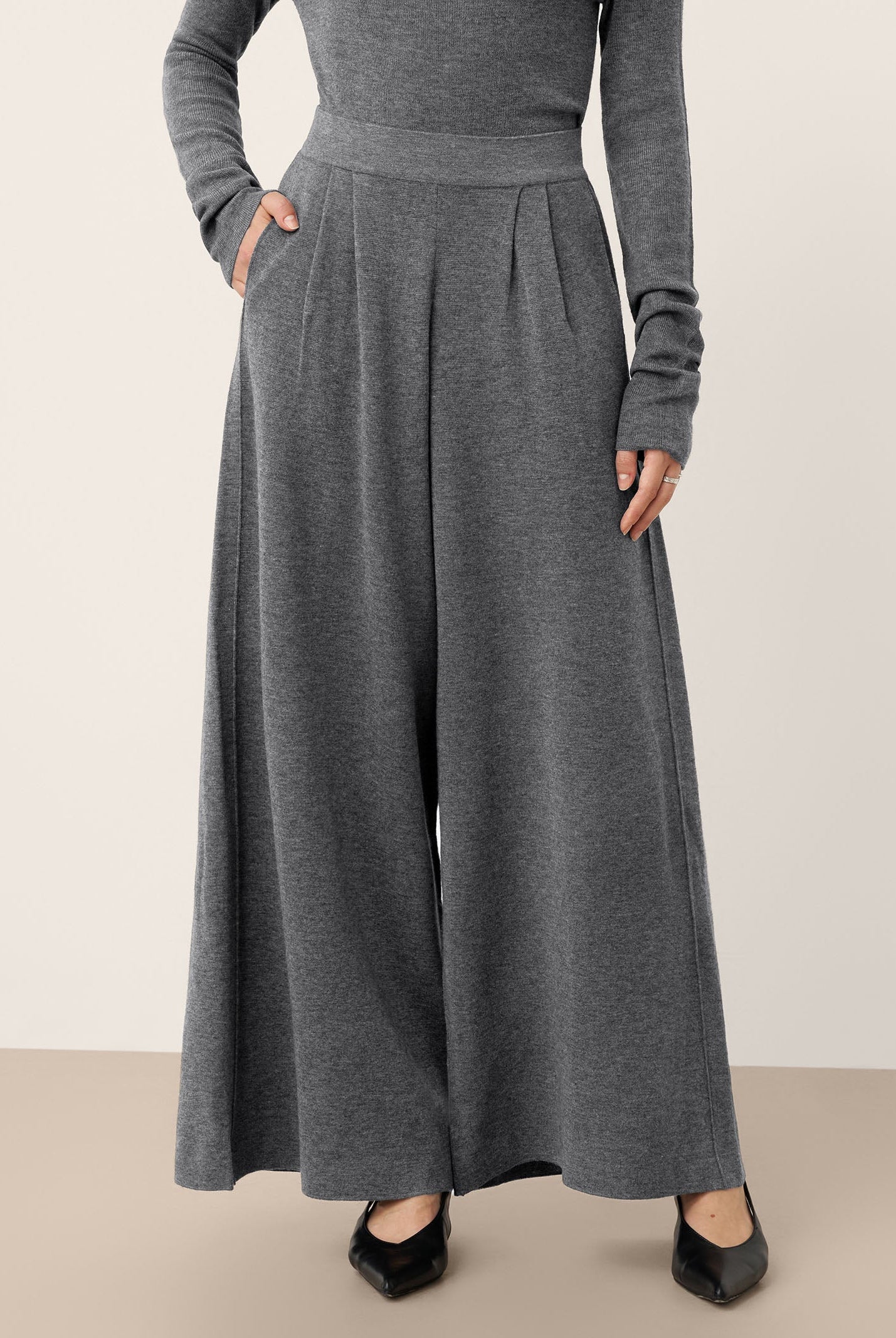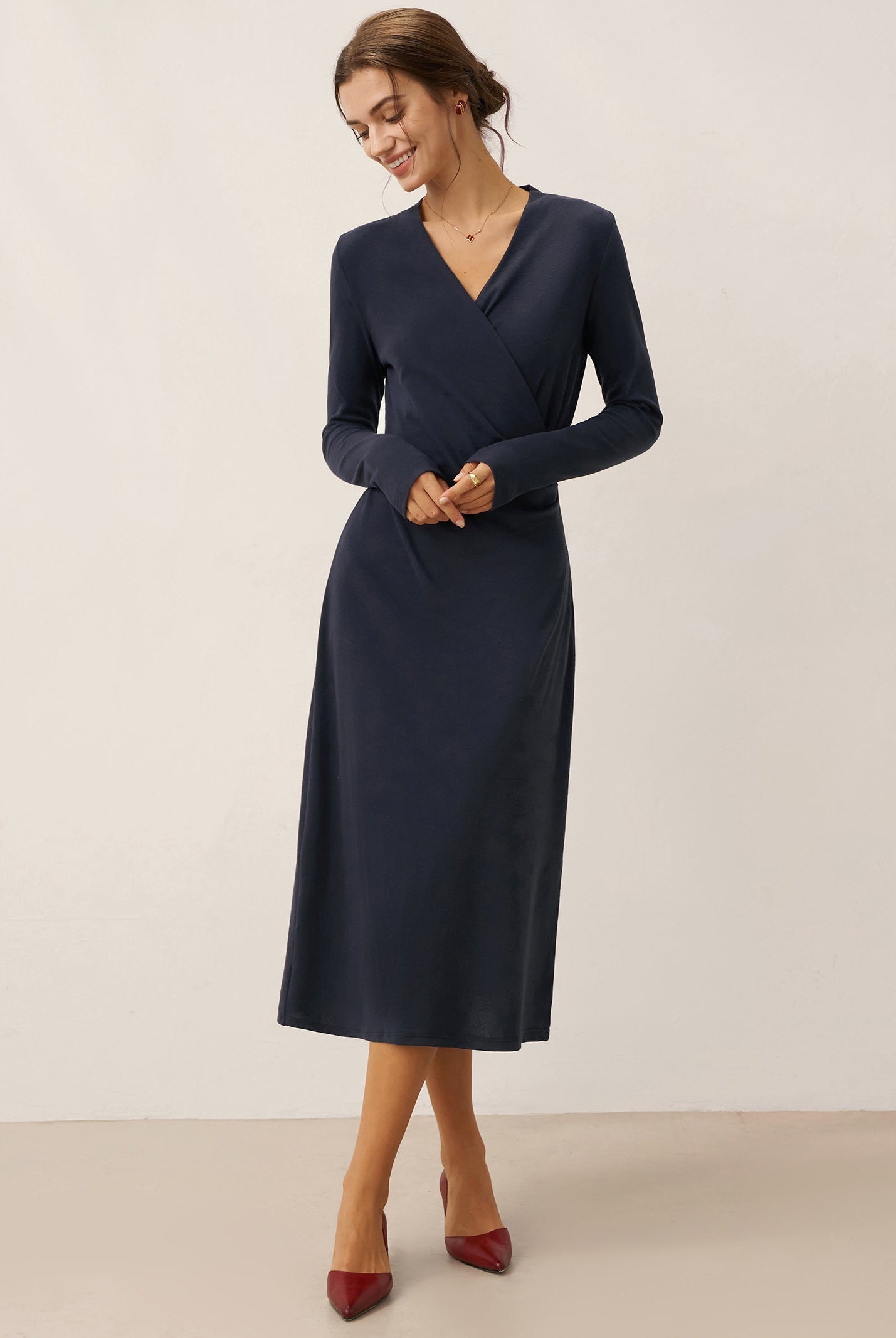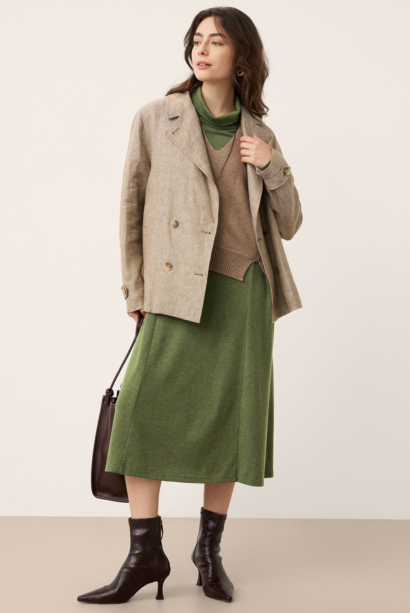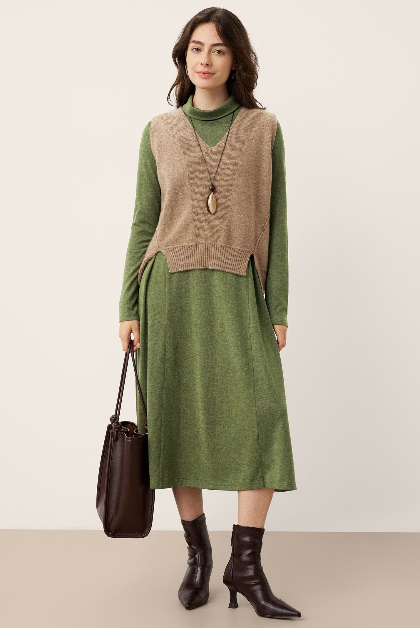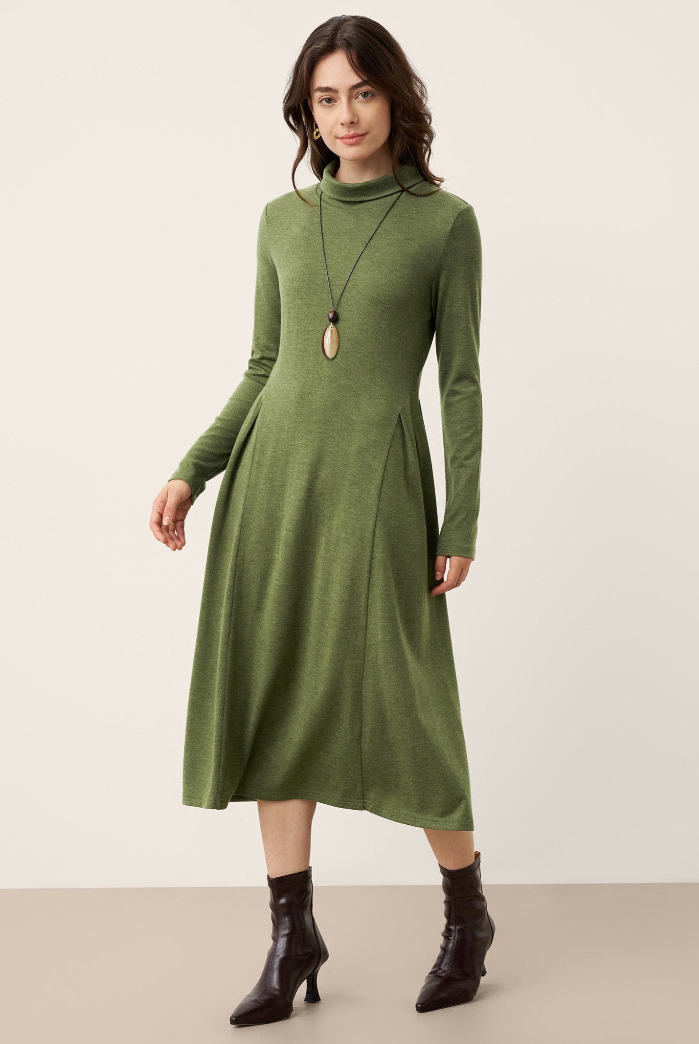 The wool turtleneck dress with sculpted pleats is a stunner. Soft fabric, perfect length, and the fit flatters so well. Got compliments all day at the office party. Worth every penny for fall and winter days.