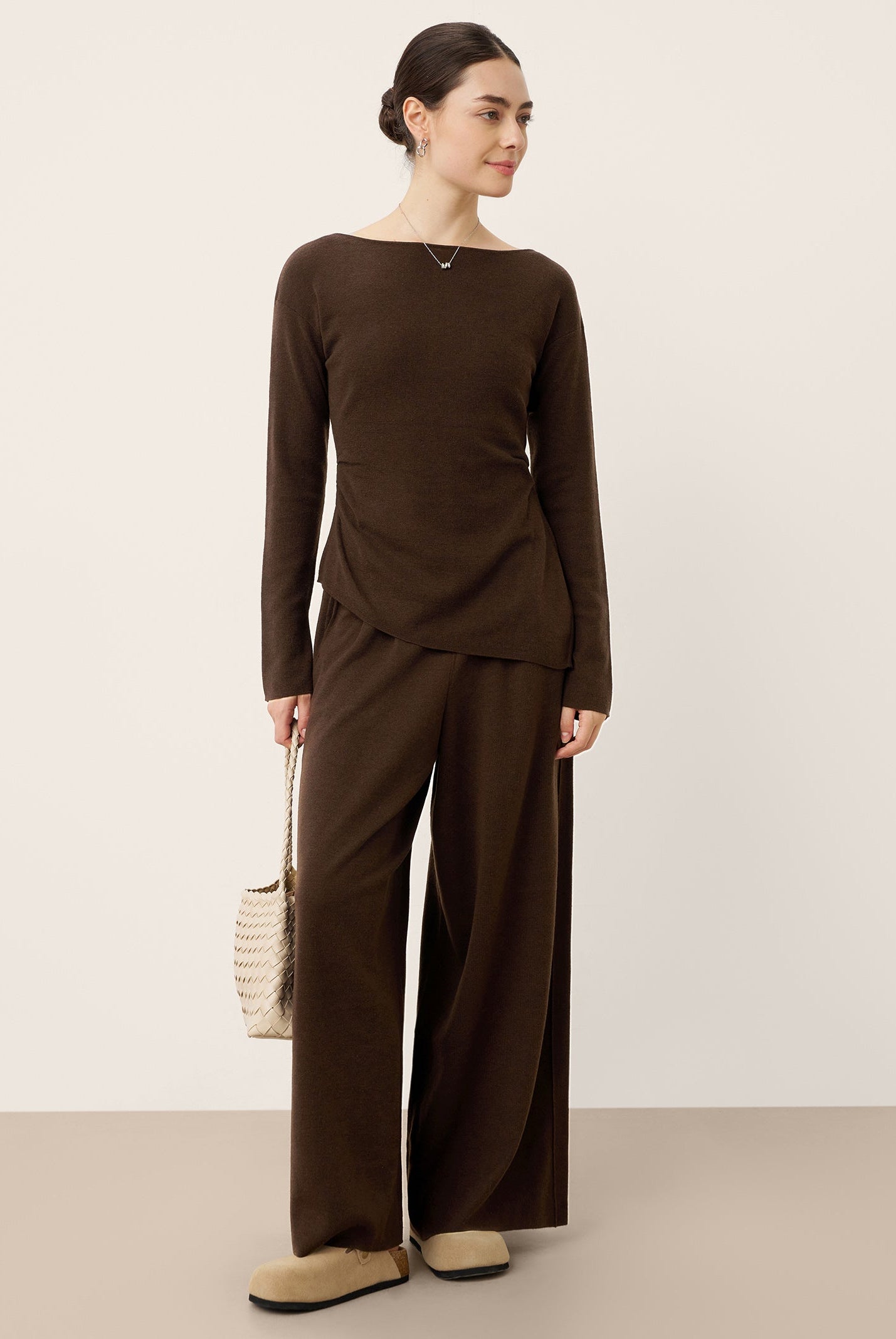 This beautiful chocolate brown lounge set is absolutely stunning!! I love the asymmetrical style of the top, the wide leg pants and this scarf needs a moment all to itself it is so pretty!!