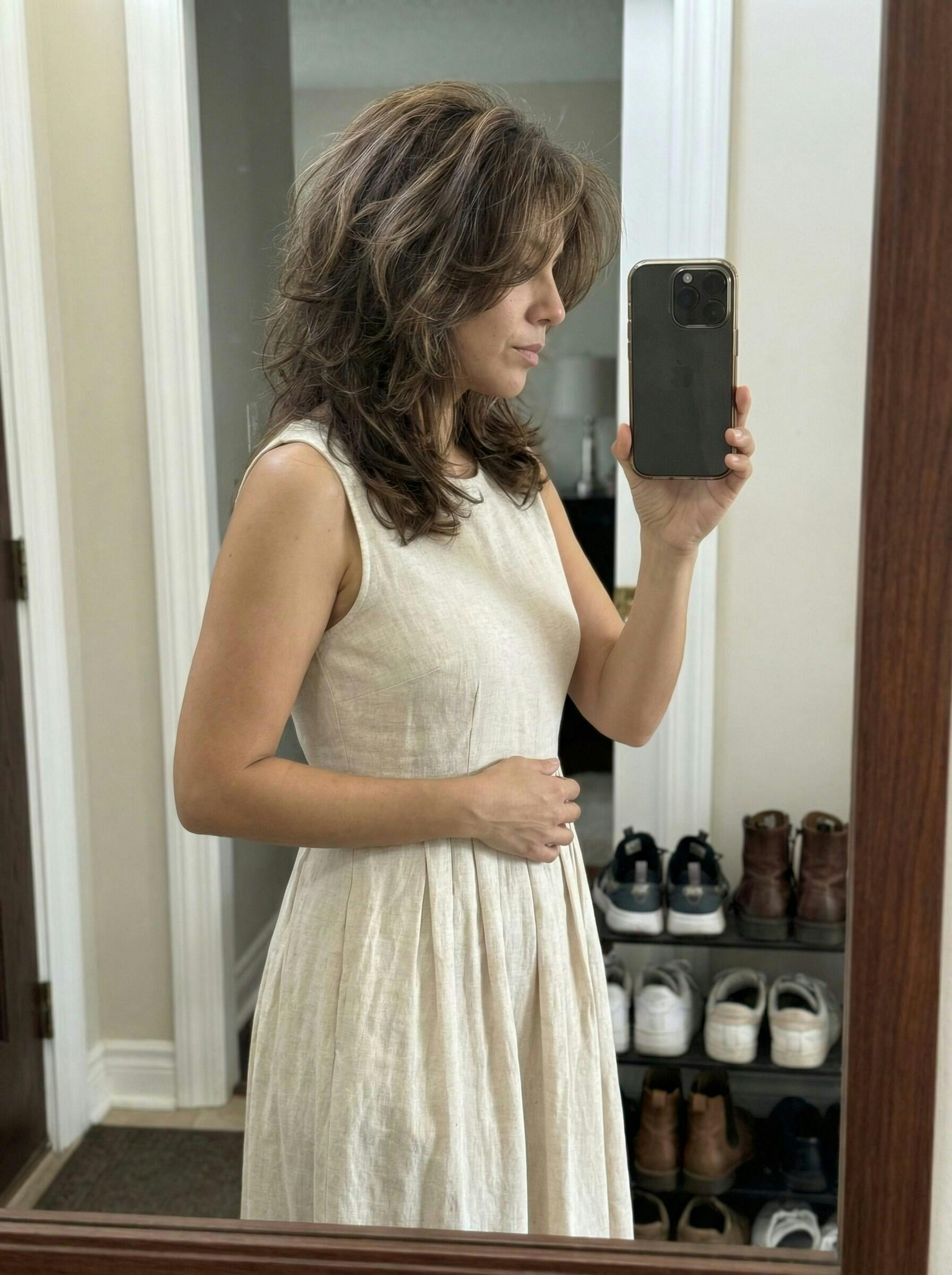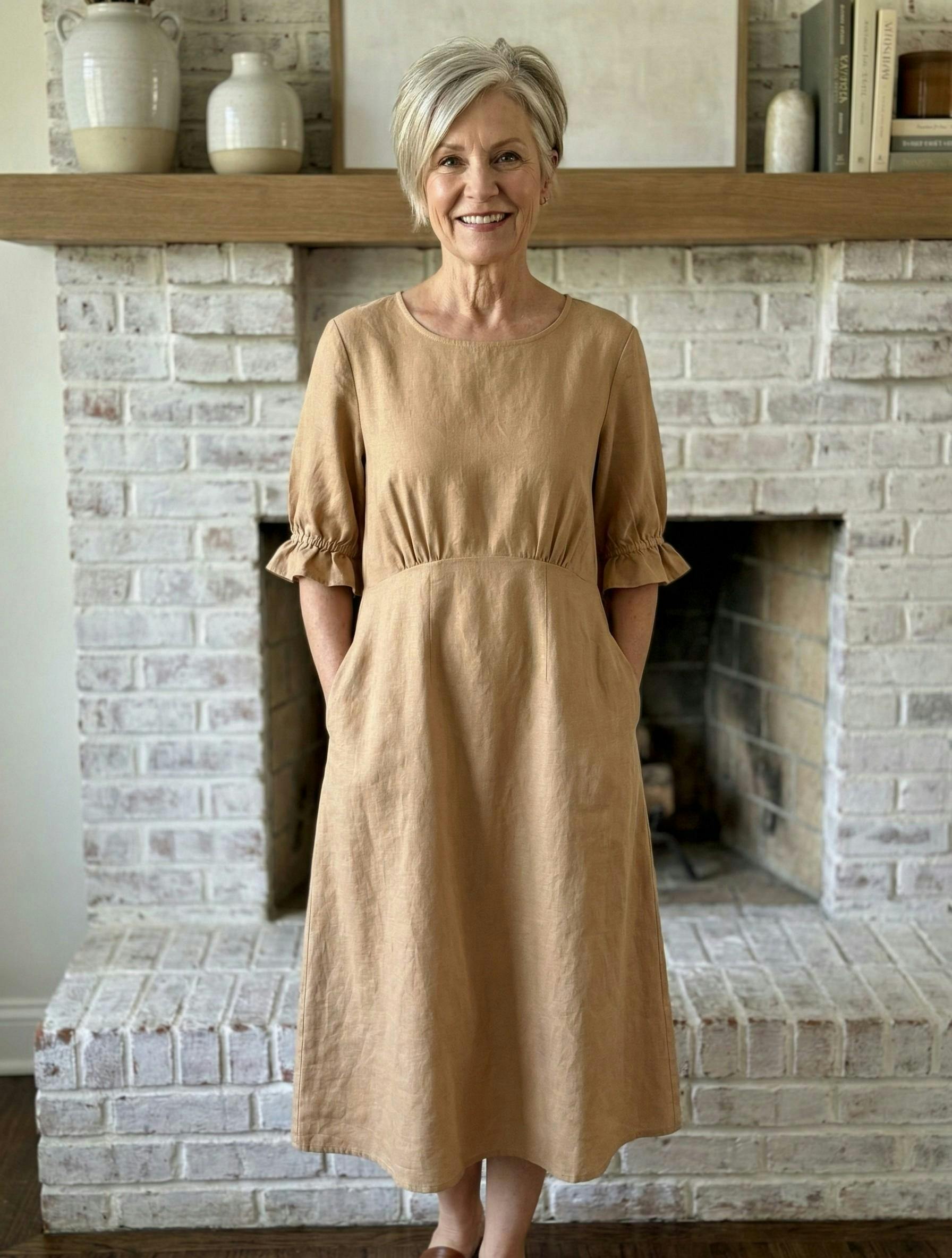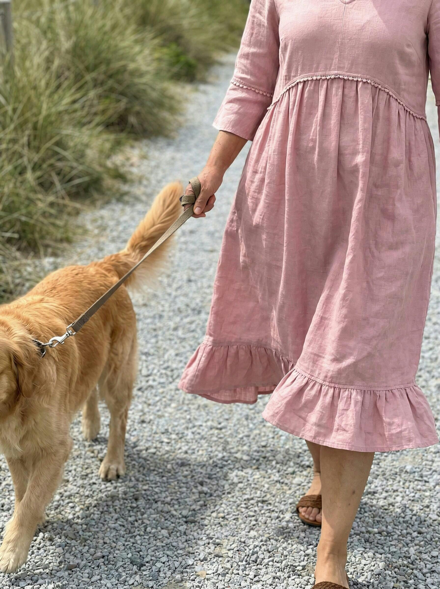 I am honestly obsessed with the quality of this piece! I ordered it on a whim, thinking it might be too youthful, but it surpassed my expectations entirely. The linen weave is substantial yet so breathable—perfect for my morning routine. I wore it today while taking Goldie out on the trails, and not only was I completely comfortable, but I felt effortlessly chic. The ruffle details on the sleeves are just stunning in person, far better than the photos. I'm coming back for another dress!