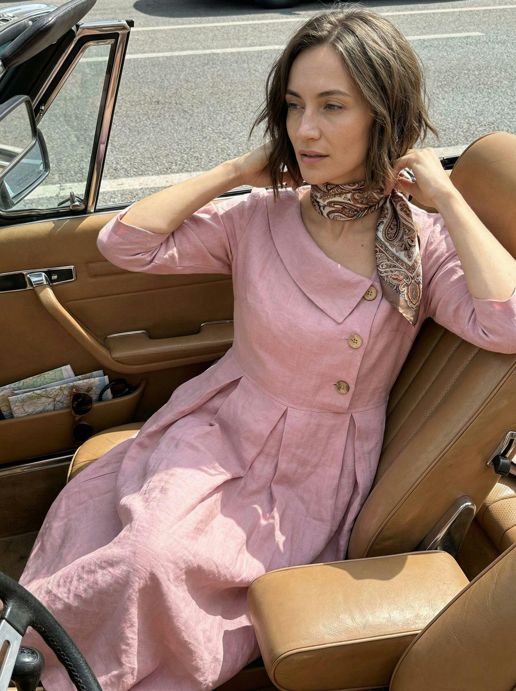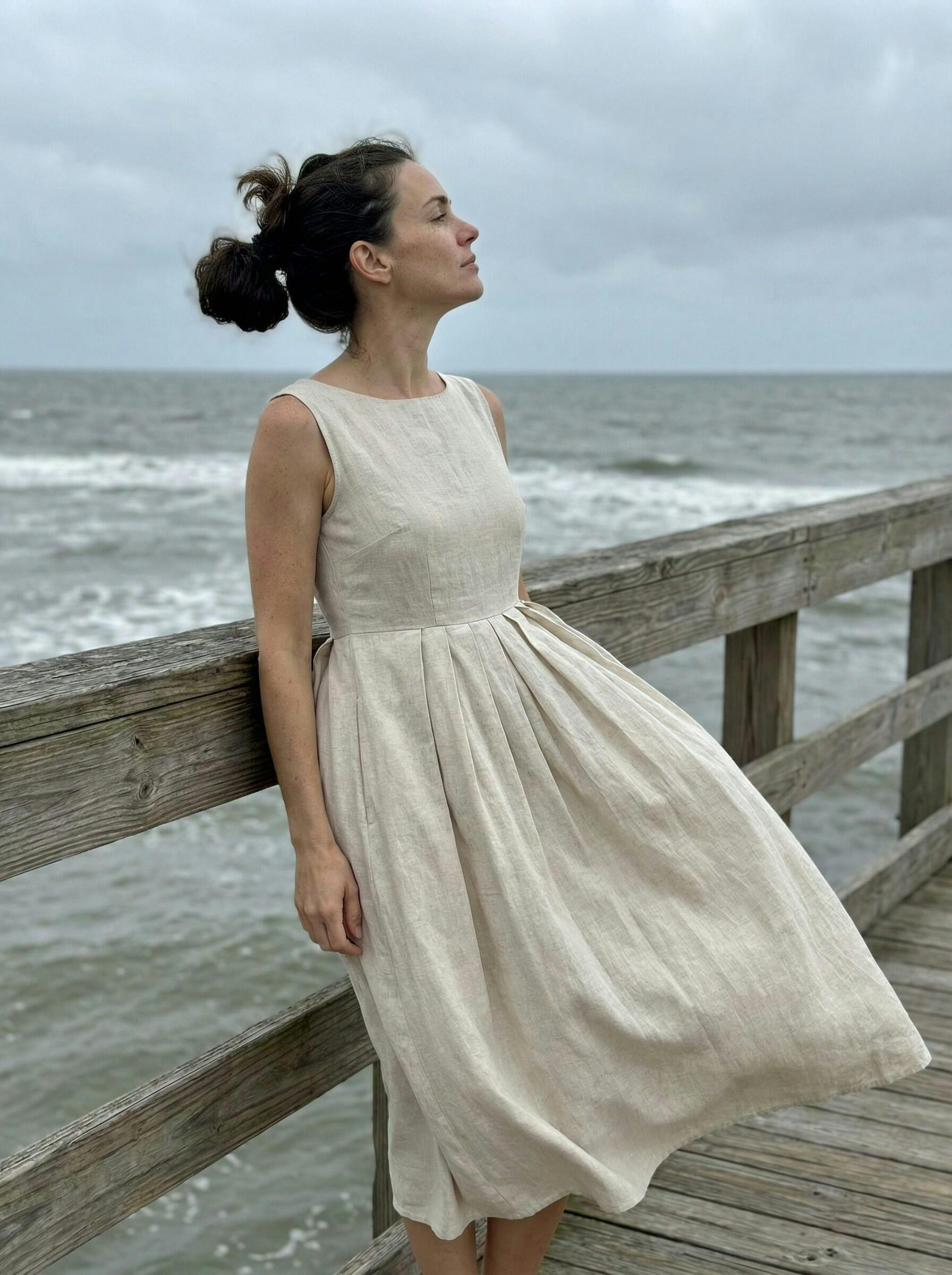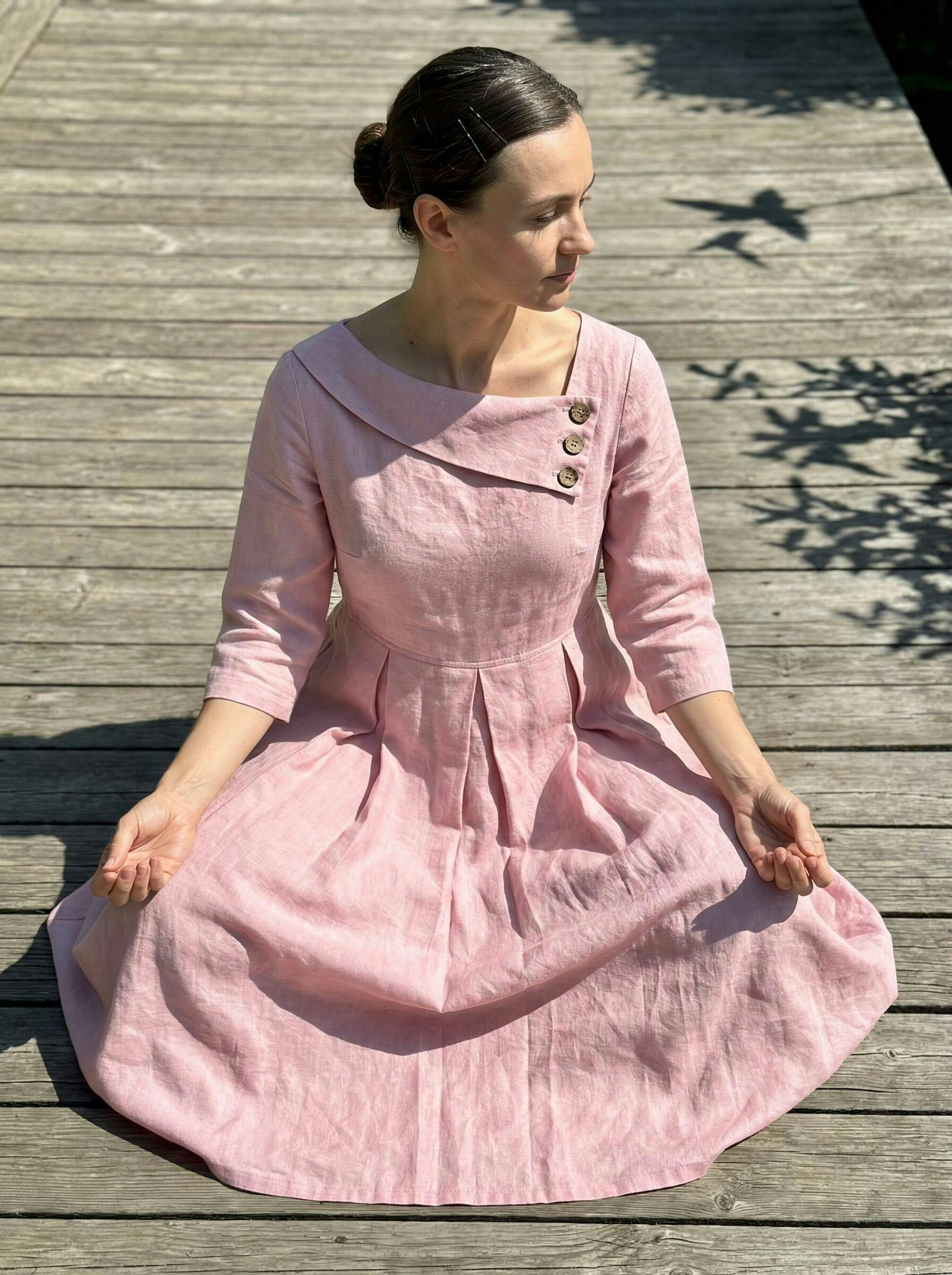 I really appreciate the quality of this dress—it's hard to find truly breathable linen at this price these days. The asymmetrical neckline and wooden buttons make it feel a bit more special than a basic everyday dress, and the pleats give it nice shape without clinging. It feels comfortable but still looks put together.