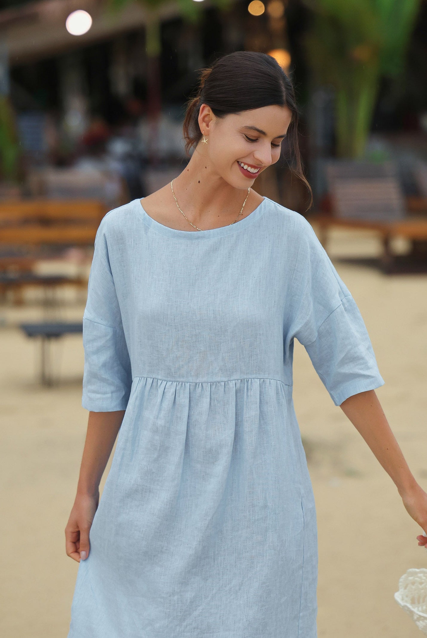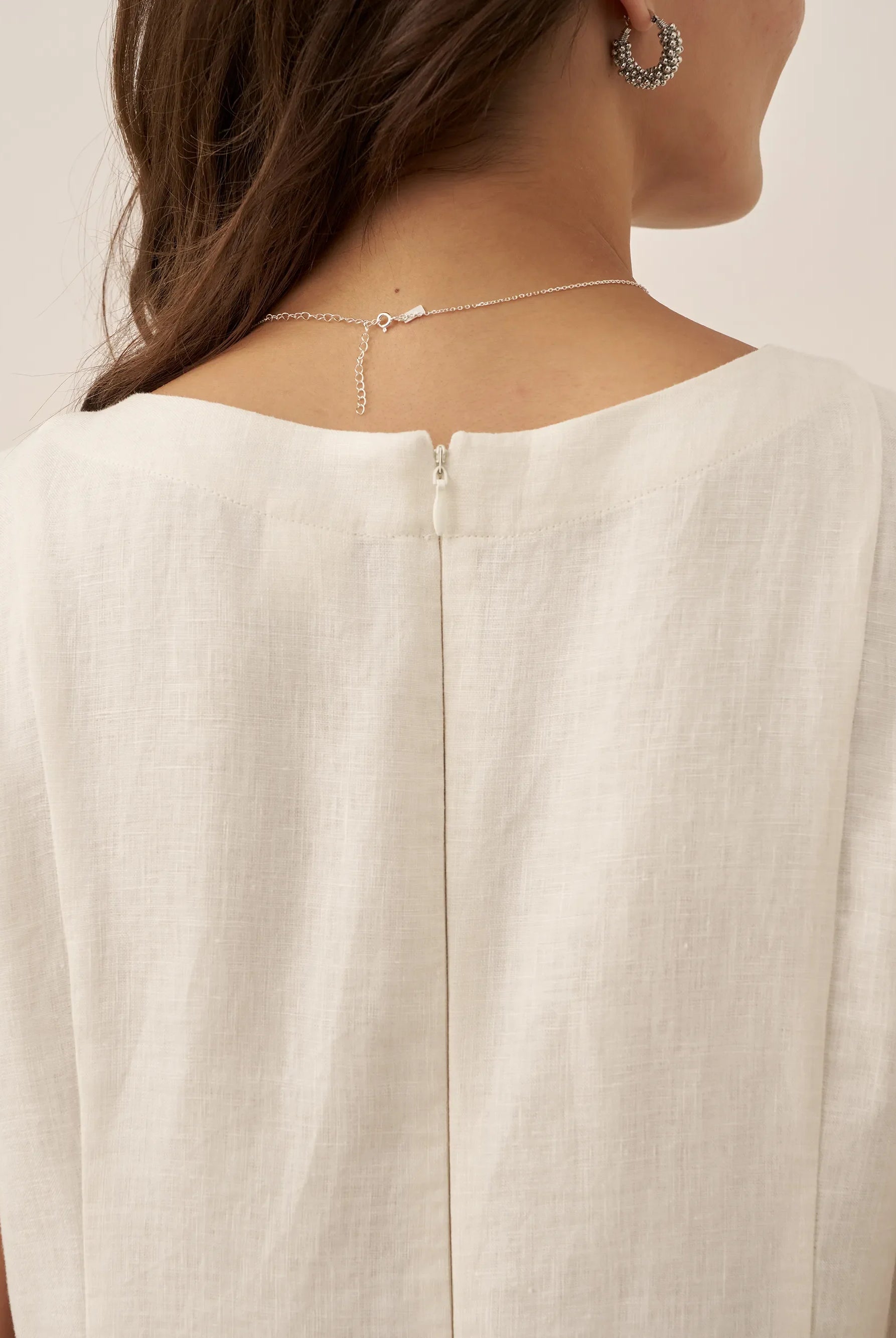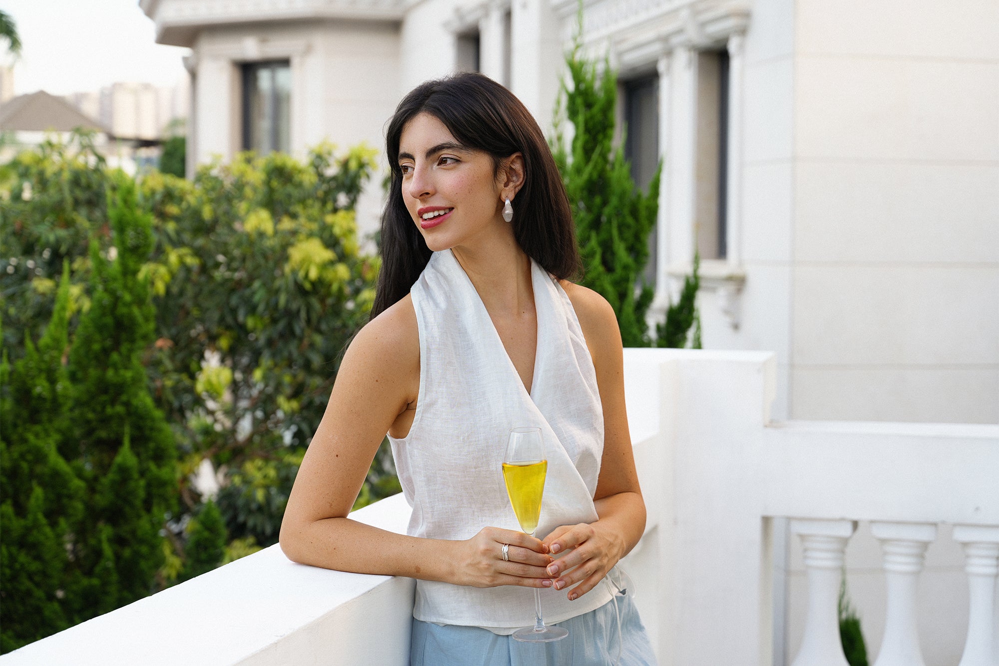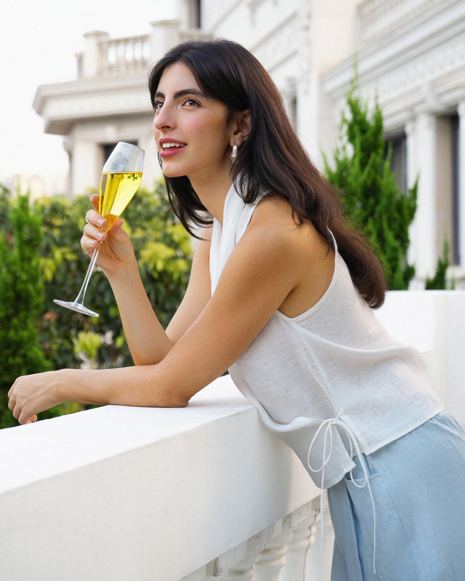 Conçu pour les soirées épaules nues, en lin FAYE qui retient la lumière du crépuscule longtemps après le coucher du soleil.