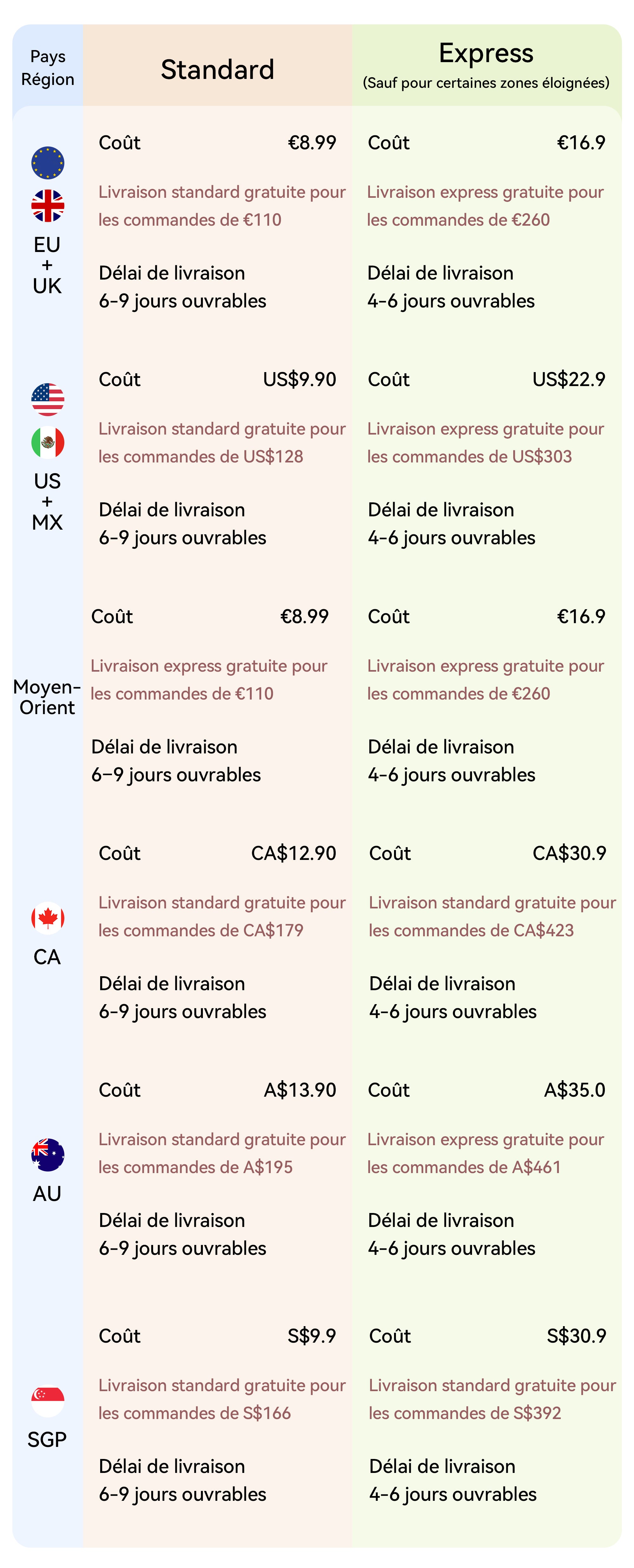 Profitez de la livraison standard gratuite pour toute commande supérieure à :