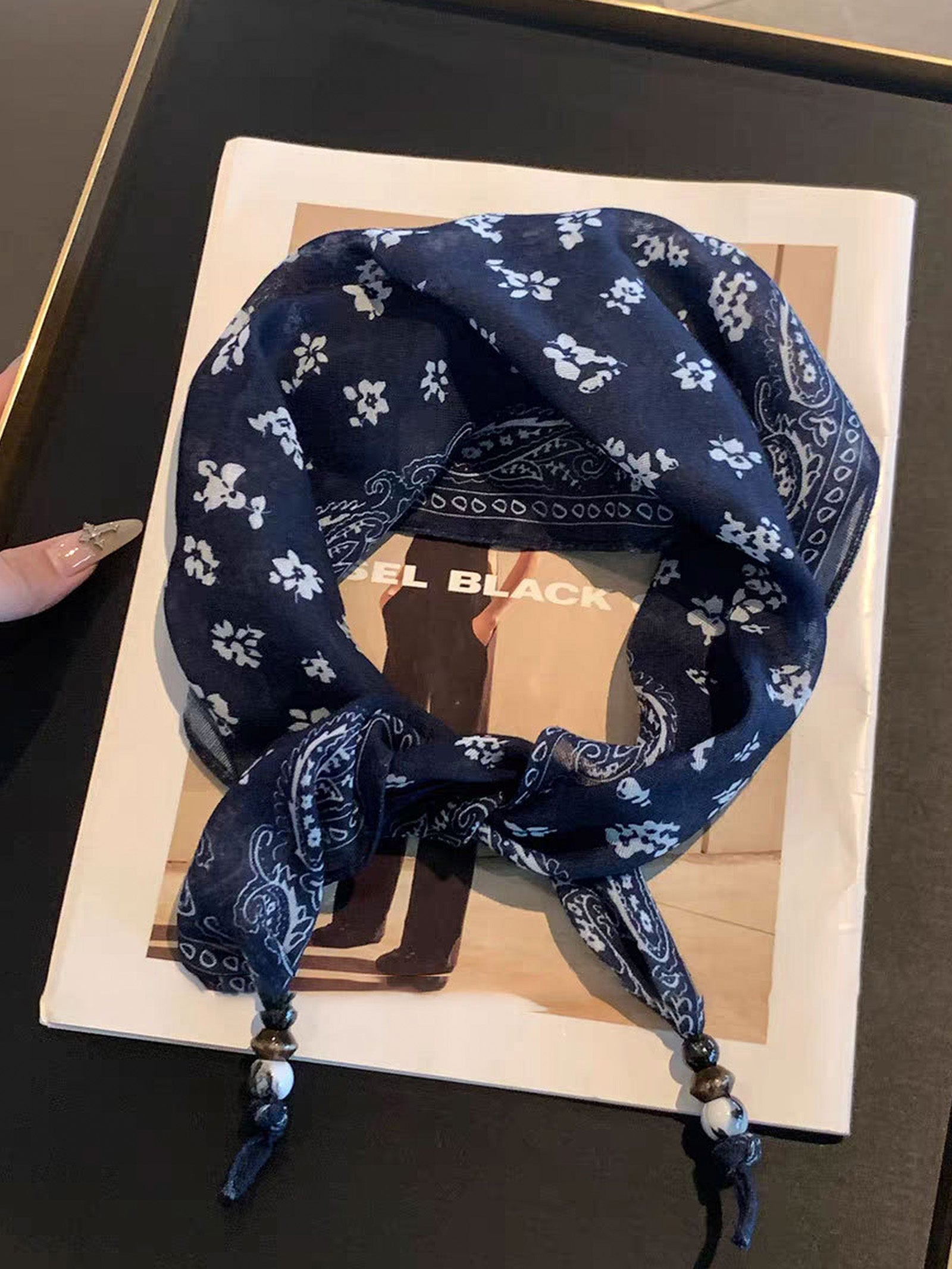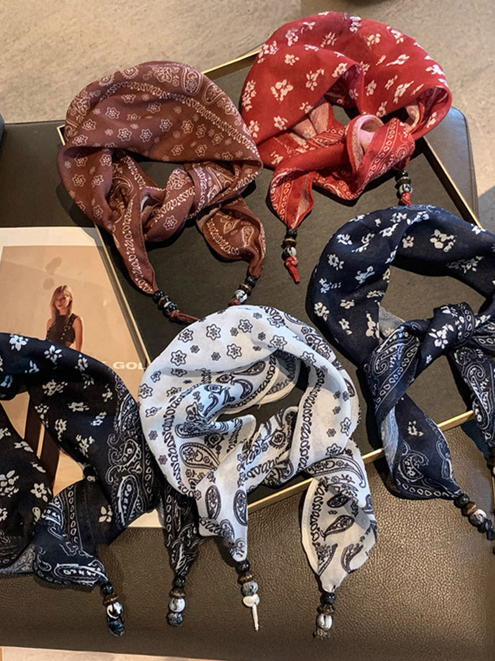 Confectionné avec un motif floral rétro bohème, ce foulard en soie peut être utilisé comme écharpe de cou, bandeau, collier ou ceinture pour une polyvalence d'utilisation. Orné de perles en bois, il ajoute un charme bohème, et sa taille de 100×30cm assure un stylisme facile.
