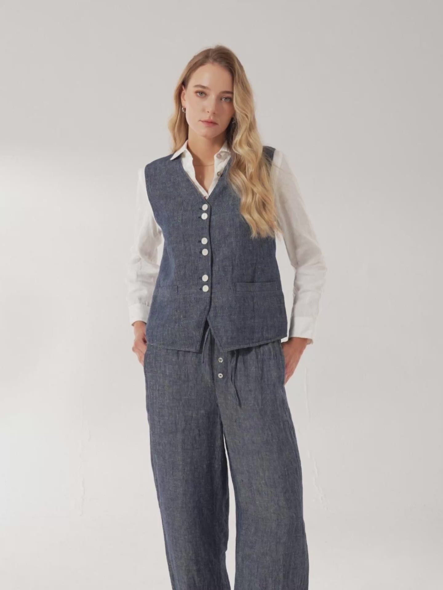 Gilet réversible 100% lin texture denim à boutons HARPER