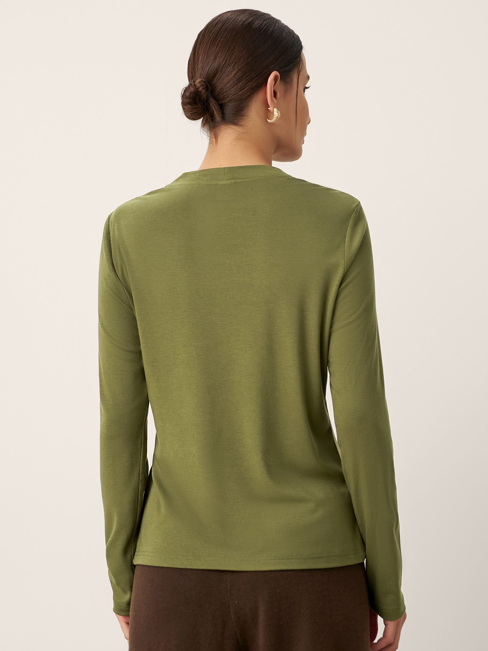 Un mélange soigneusement équilibré de fibres haut de gamme — cachemire, TENCEL™ et modal — crée un tissu aérien qui offre une sensation douce, lisse et parfaitement naturelle sur la peau.