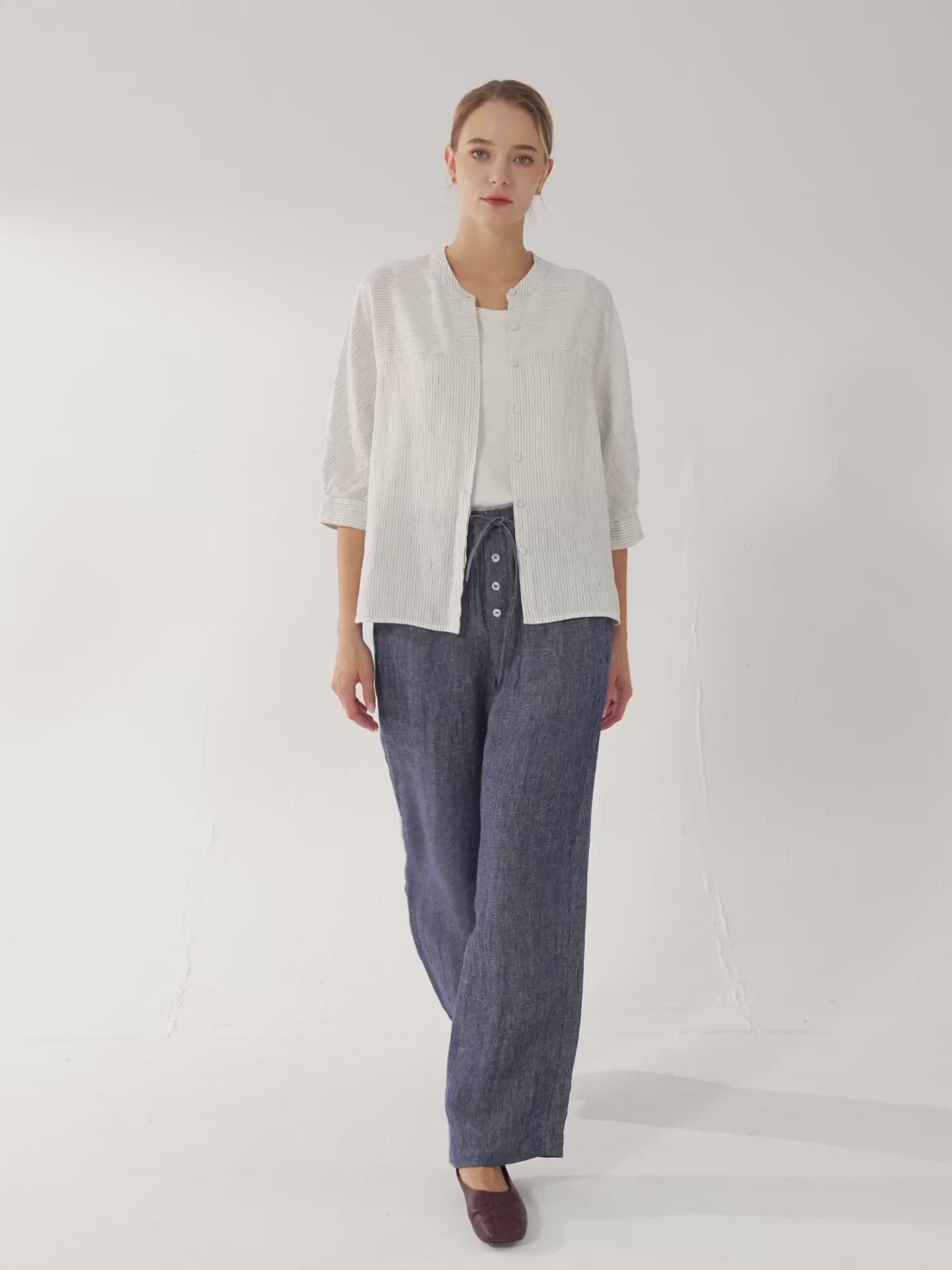 Le pantalon en lin-denim décontracté d'inspiration naturelle allie confort et fonctionnalité à des détails artisanaux.