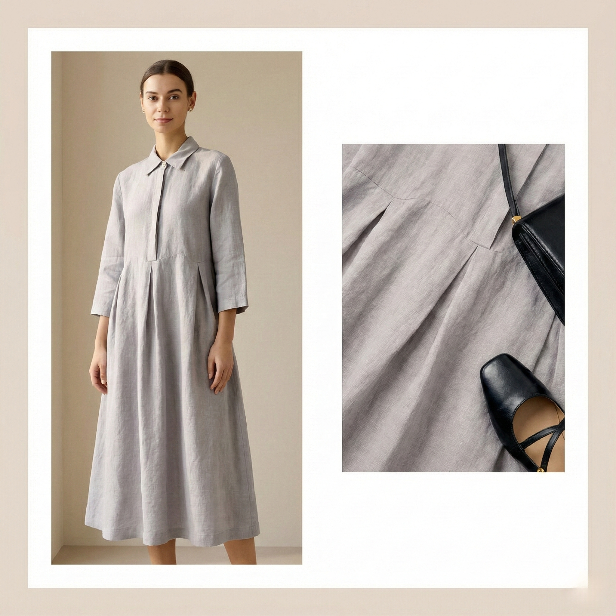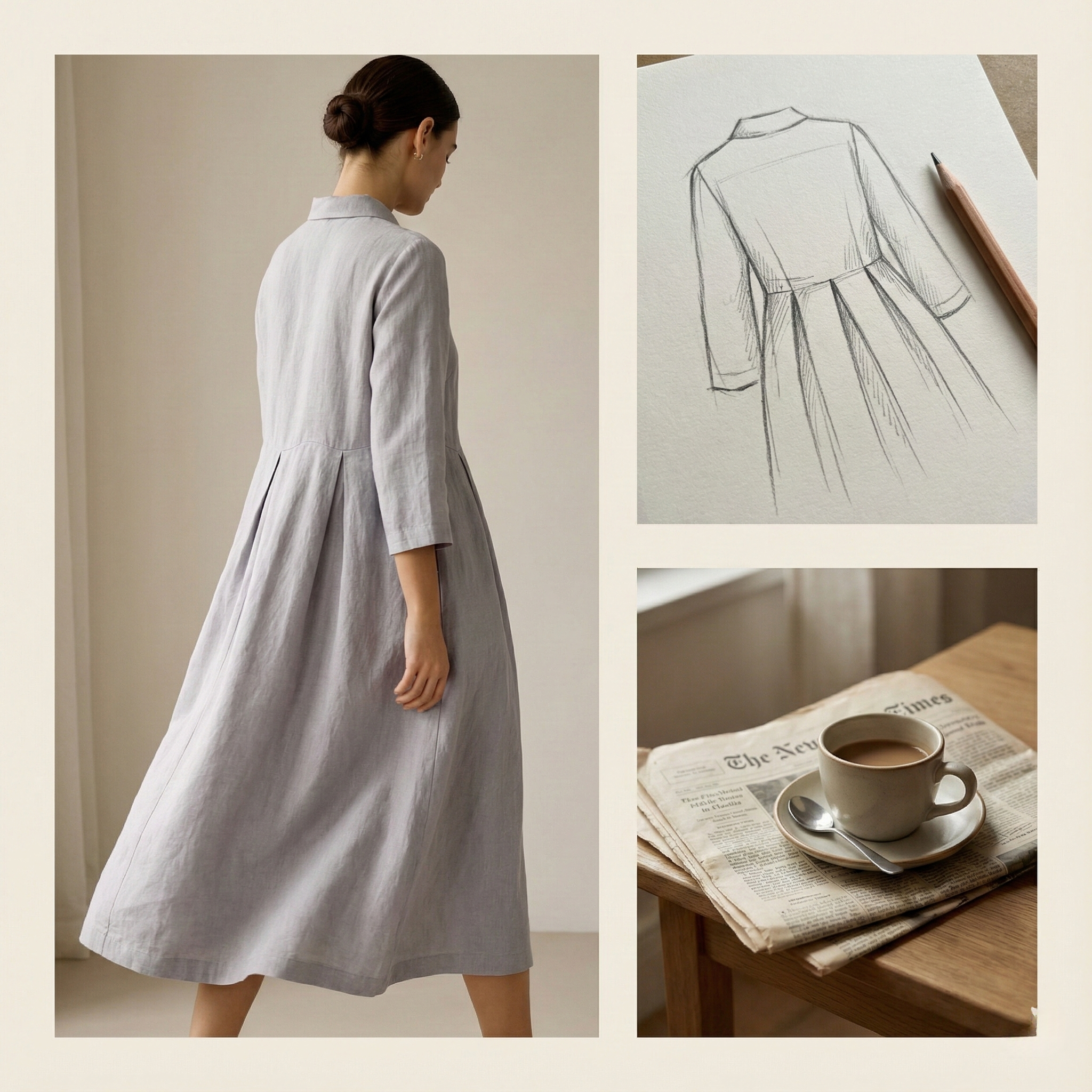 Ils redessinent la taille, allongent la ligne du buste et apportent une structure fluide, pensée pour être élégante sans effort. Chaque détail est placé pour créer de l’aisance, du rythme et une sensation de justesse — une robe qui accompagne la journée, du matin jusqu’au soir.