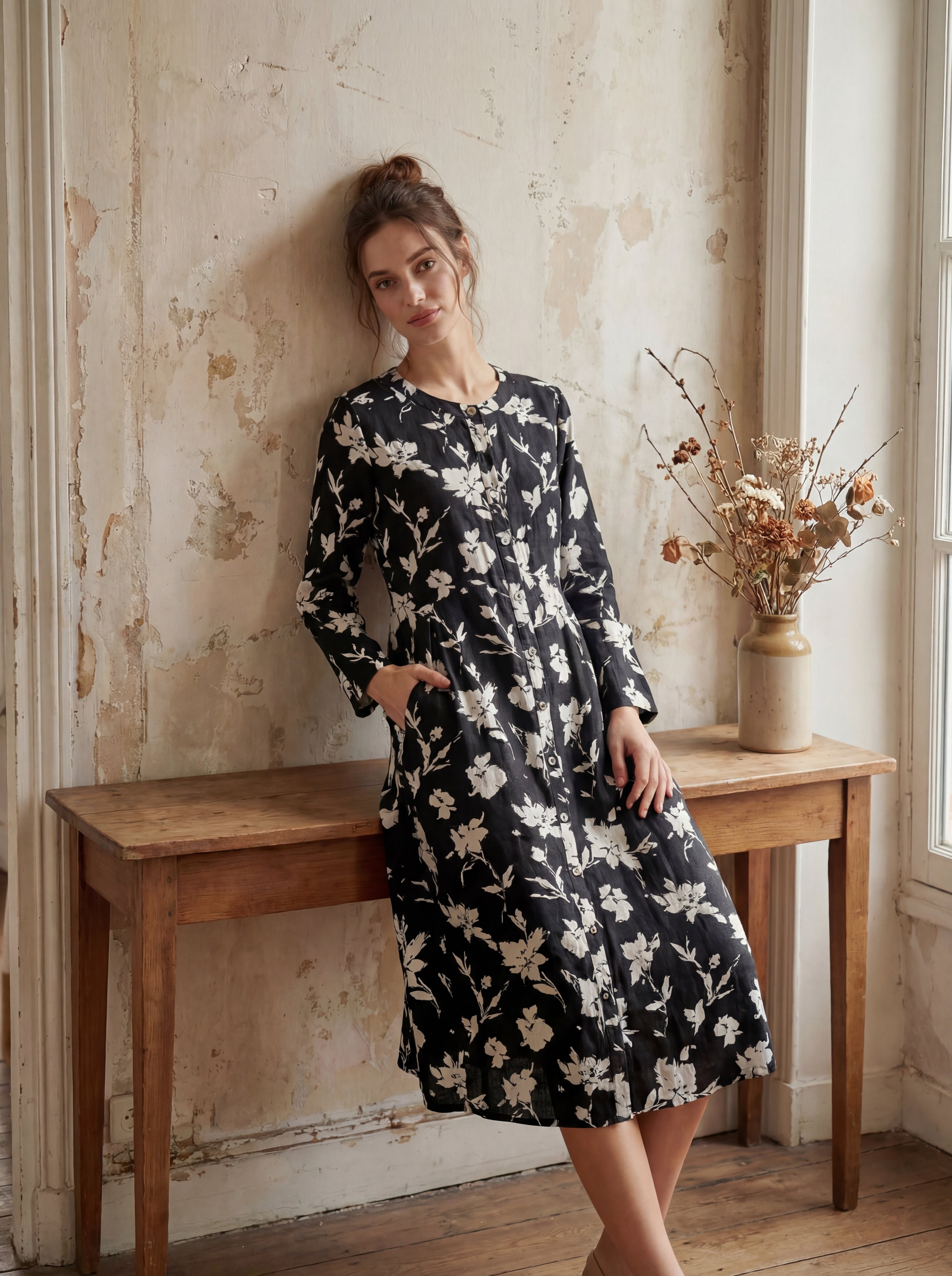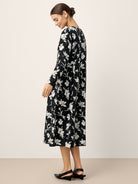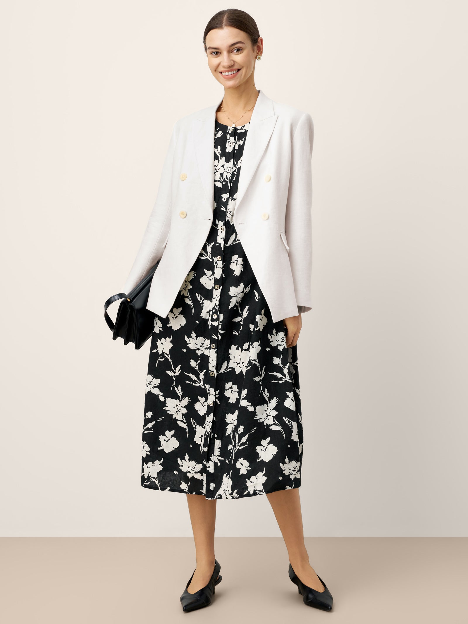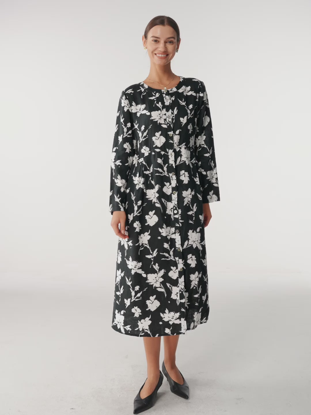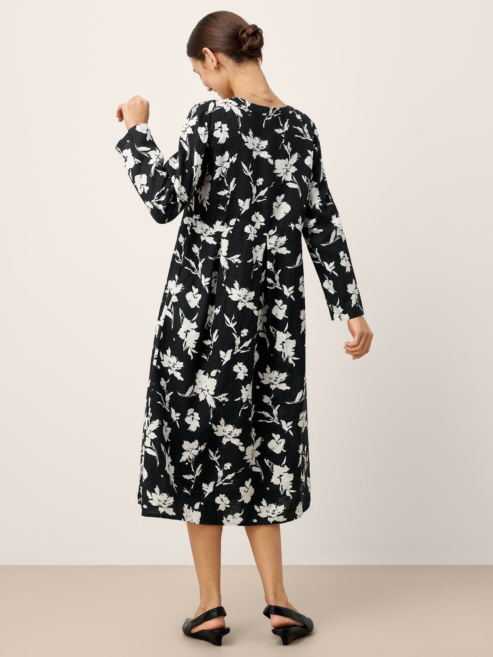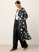Cette robe longue 100 % lin rehausse l'élégance décontractée avec son imprimé silhouette de magnolia à contraste élevé et ses plis inversés sculpturaux à la taille, vous drapant dans un confort respirant qui murmure la confiance à chaque pas.