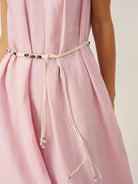 Cette robe longue à col structuré est une pièce élégante et confortable qui allie des éléments classiques à un design moderne. Elle est accompagnée d'une ceinture en corde tressée avec des embellissements perlés pour un style ajustable.