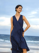 Robe longue une-pièce à col en V et ourlet à volants en 100 % lin MAYA